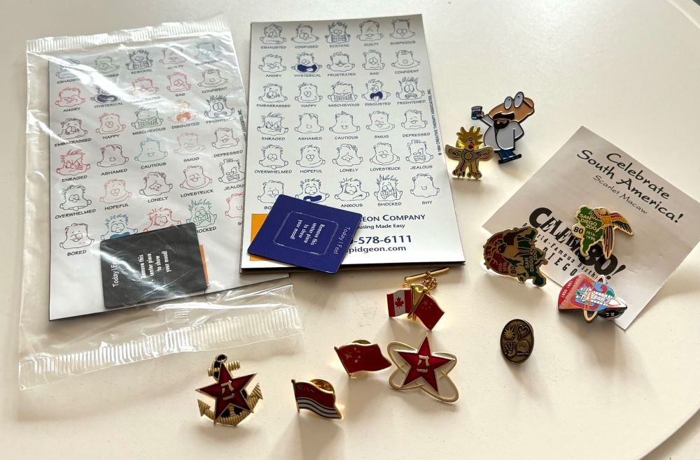 也收集过纪念章,都在北京家中。凡是有运动会就有像章,或者其它活动,都尽力搞到。下片里只有这些(在美国)。几枚军章是中国海军第一次访美(SD)时,跑到军舰上讨来的;没有找到美中旗子;右边三个是去SD动物园得的;白大褂是纪念美国Doctor Day:一堆不同表情的小脸是磁贴,依你每天的心情框个小脸:)。(在俺办公桌旁,框着的小脸一直是OVERWHELMED, 哈哈哈)