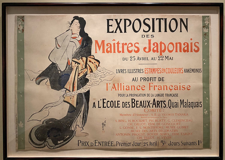 日本浮世绘于1860年前后传入巴黎,立即以独特的风格和雅致的装饰风格得到市民们的追捧,对印象派画家形成巨大影响。下面是一张Jules Chéret所作日本艺术品展览的广告。