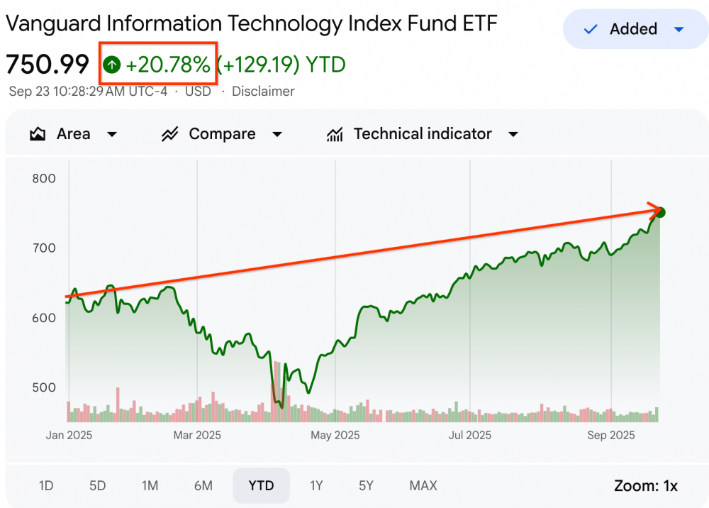 2025年9月22日,美股又创历史新高!从年初到当天,标普500指数已经上涨了13。9%,纳斯达克100指数上涨了17.8%,而我重仓的先锋科技指数基金VGT则上涨了21%。