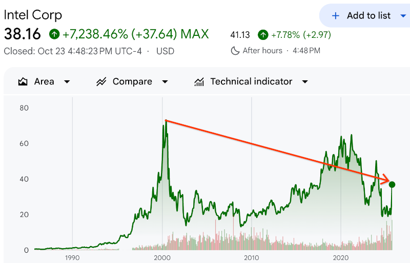今天美股收盘后,曾经是硅谷市值最大的公司,英特尔公司,发布2025年第三季度财报。