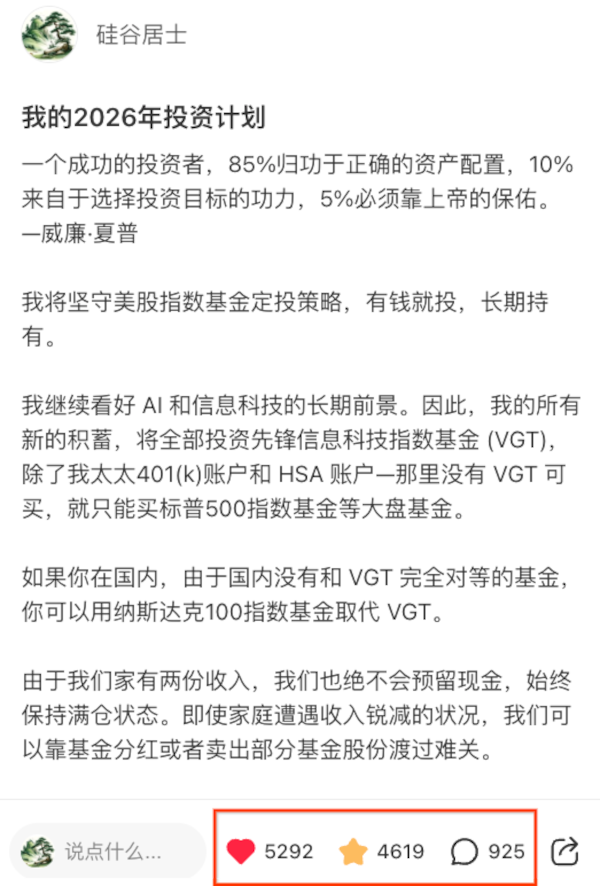 附二:我的另一片置顶笔记“我的2026年投资计划”的截图。该笔记获得9千多个点赞加收藏。