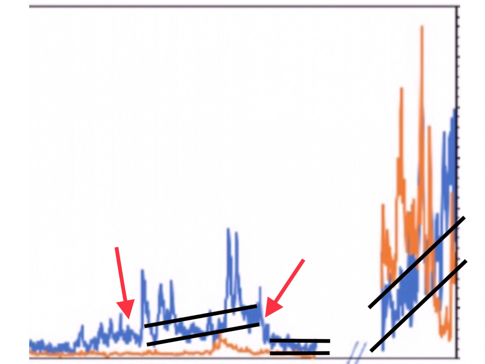 如果把图五中的这段曲线除以五,其中间值或平均值就变成~6ng/g,在4ng/g和8ng/g之间随机波动。这段曲线与后面曲线的相接处会出现一个坎。