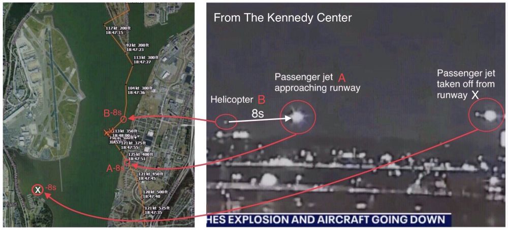 空难发生在2025年1月29日下午8:48。一架载有60名乘客与4名机组人员的客机,对准了DCA的跑道,正在下降飞行;被一架有3名机组人员沿potomac河由北向南飞行的黑鹰直升机撞击,在空中爆炸形成一个火球;随后客机与直升机都沉入河中。