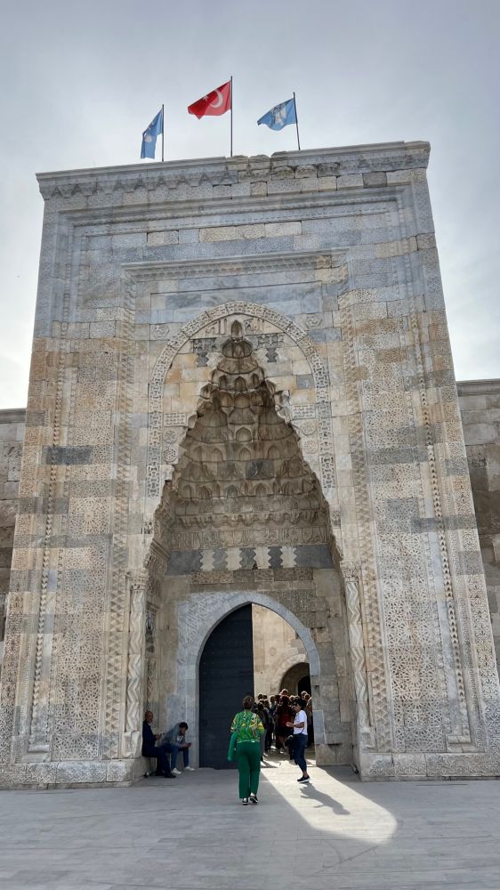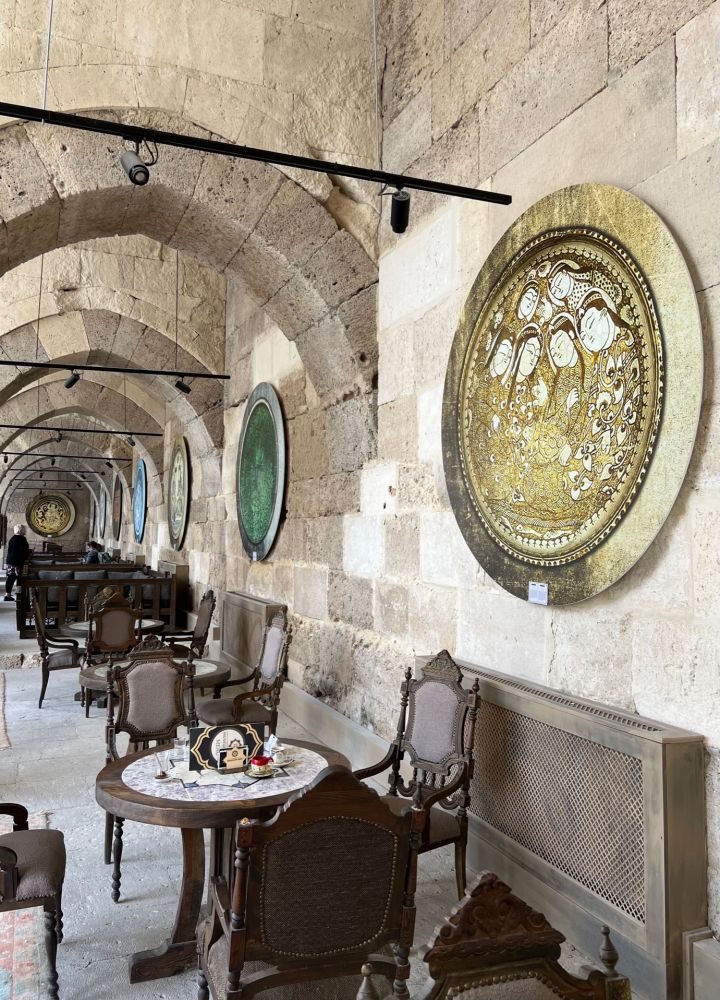 从安塔利亚出发到卡帕多奇亚500多公里,一路开去,气候地形地貌与滨海地区有了不小的变化,暑热已消,秋意盎然。中途在孔亚 Konya 停留吃饭,参观景点。孔亚位于土耳其中部,城市很大,穆斯林势力强大,保守,看到街上妇女大多黑袍,上下包裹的严严实实。建于1229年的古代驿站是必游景点,据介绍驿站为商旅客人免费提供三天食宿,超过三天需交费或以货物代偿,驿站也是丝绸之路的一部分, 内部装饰有东方元素。很棒的建筑,令人赞叹的历史,留下深刻印象。继续赶路,傍晚到达格雷梅 Goreme - 卡帕多奇亚地区的中心,很干净很时尚的城市,入住市区酒店。