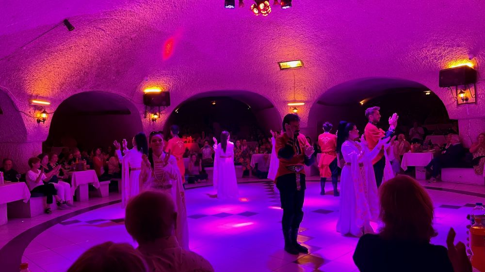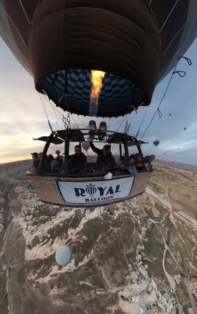 卡帕多奇亚的热气球是选择项目,额外收费,但也是必游项目。导游说热气球最近价格狂涨,250美刀涨到350美刀每人,再贵也要去,来都来了。起一大早,热气球公司派豪华奔驰商务旅行车接我们到热气球起飞场,诺大的场地,数不清的热气球在准备起飞,很壮观。长方形的吊篮,一边容8人,机长和副驾驶在中间操控。天蒙蒙亮,气球起飞,缓缓升起,一吊篮的人无不欢欣。平稳上升到600米高空,空中无风,环顾四周无数个热气球在空中飘飞,天上明月高悬,地下独特的地貌,奇山异石,东方露出曙光,朝阳升起,日月同辉,一幅精美难忘的画面,可惜无法将日月同框纳入镜头。空中停留了约45分钟,拍照无数,气球慢慢下降,机长和地面人员配合,完美精准地将气球吊篮停在拖车平台上。全体人员就地举行庆祝仪式,香槟果汁,巧克力鲜果,机长给每人颁发了荣誉奖章。结束了热气球之旅,回酒店吃过早饭,继续游览,远古地下城,洞穴教堂壁画,地貌公园,尽览卡帕多奇亚之精华。晚上,乘车来到一个外面黑灯瞎火的洞穴式大厅,土耳其之夜歌舞晚宴在此举行,美酒佳肴,帅哥美女,音乐歌舞让我们度过了一个欢快的夜晚。