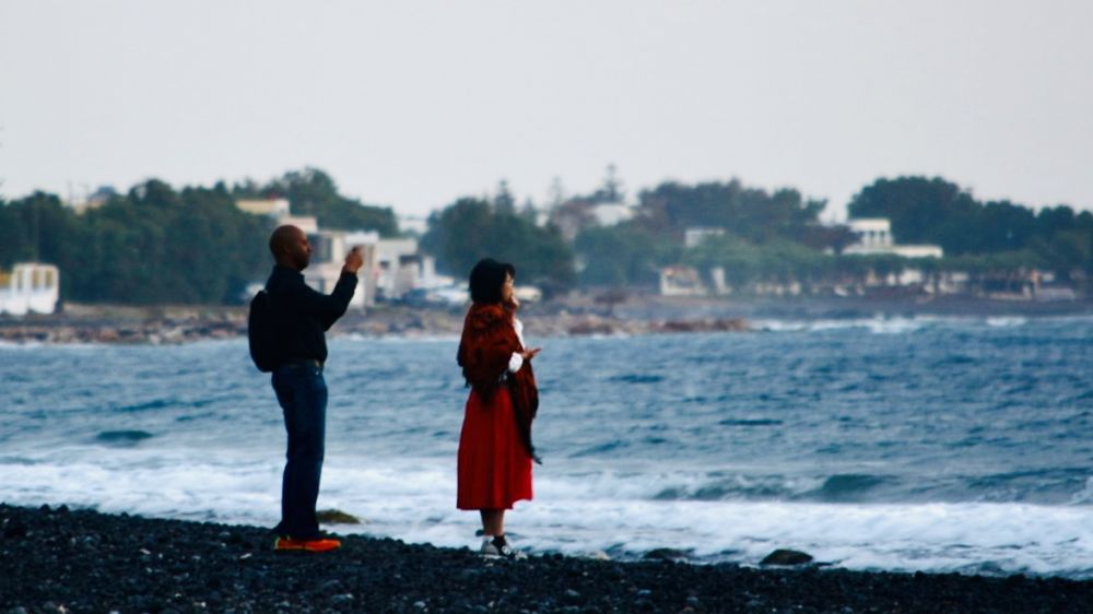 雅典观光一天后去圣托里尼岛。清晨5点起床收拾妥当,6点准时在酒店门口等旅行社的车送我们去港口,过了20多分钟车仍没来,有些着急,打电话询问怎么回事,正说着,车来了,司机说是旅行社发错了信息,耽误了。很快送到港口,上了去圣岛的轮船。船上人满为患,旅行社给我们订的经济舱,没有固定座位,找不到座位便去服务台升级商务舱,结果商务舱全满,又拖着行李前前后后,上上下下找地方,花了一个多小时,终于在船尾一通道角落搬两把椅子安顿下来,没想到经济舱竟如此狼狈。海上风大浪急,船晃晃悠悠的,还能忍受。船开了3个多小时,到达一个岛,下去不少乘客,马上在大厅找到空出的座位,舒适了许多。终于可以踏踏实实体验海上航行了。航行7个多小时,中途停留数岛,有人上船,有人下船。各岛景色相似,裸露的岩石,清一色白色的建筑,偶有蓝色的屋顶,看不到郁郁葱葱。终于到了圣岛,下了船,找到举着牌子接我们的人,了解后几天的安排,基本上就是:管接,管送,管住,其它一切自理,自娱自乐。顺利送到酒店入住。酒店位于圣岛东侧的Kamari 海滩,是打卡日出的所在。于是连续两天,每天一大早都到海边看太阳从东方升起。远方海面映出一片红光,随之海平面出现一个红点,徐徐升起变大,金光四射,几分钟之后跃出海面,变成一个圆圆的火球。潮水拍岸,浪花飞溅,涛声贯耳,半个月亮爬上来,与朝阳相望,日月同辉。寂静的海滩,寥寥数人,一对情侣相依而过,见他们走远 ,拍其身影,那女子的一袭红衣,为爱琴海的旭日初升平添了几许妩媚。