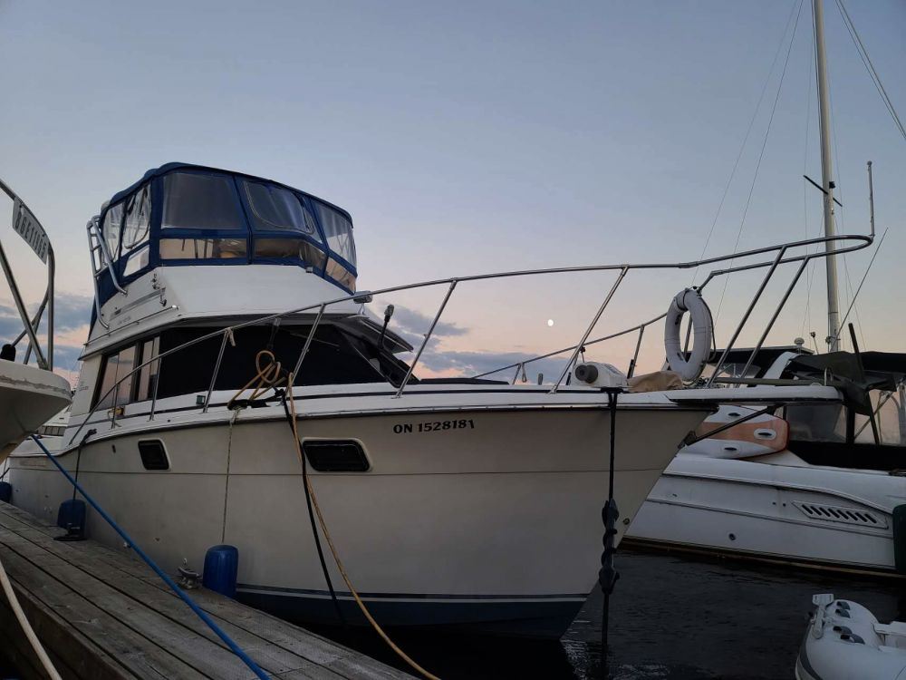 很快我们在距我家30公里左右的StonyCreek又发现了条32呎的船。船主是小两口,也三十岁左右。男主人轻松地将两台发动机启动,我听到了强劲而又十分干净的轰鸣声。两台巨大的发动机就在我们所在船仓的甲板下,然而其微小的振动和声响让我这个半专业人士颇感惊讶。前任船主是我们密市一港口著名餐馆SnugHubour的老板,他们是朋友。夏天小两口时常驾船跨湖区那里吃饭。