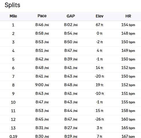 除了第一个mile没有收住,最后一mile冲了一下,基本同样配速。心跳在前9mile前一直平稳,后面就控制不住了。