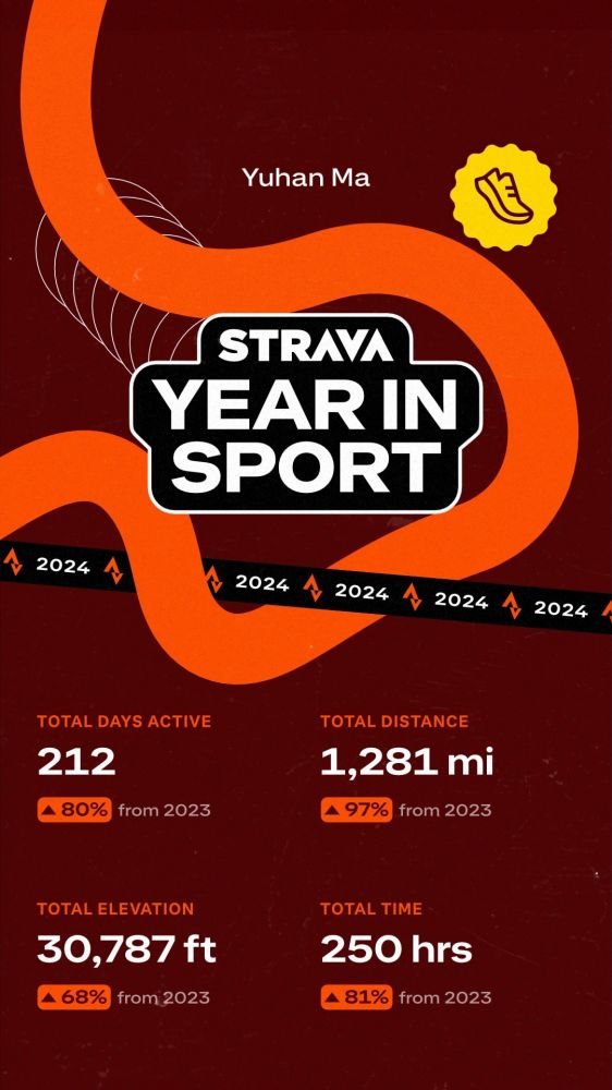 2024年底没到,大家就迫不及待的show off了。我也跟风发一下。今年是我第一次从头到尾执行Consistent, Strucutured 训练。运动量比去年多了一倍。主要练跑步和举重。年初定的目标半马进2,Squad 1x body weight, deadlift 1.5x body weight 都实现了。现在觉得跑步还在进步,weight lifting进步很慢了。有时同一个重量反反复复的好几周。明年要跑个首马,想上半年半马进1:55,下半年全马4:30. 举重继续,暂时不定目标了。