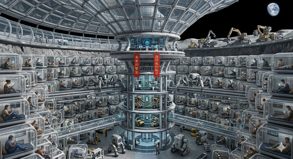 我相信,未来会有狂人去试,会有几十亿的吃保人群支持,基本可以碾压选票的所谓民主。政府会收取70%的税,美其名曰”多劳动者光荣“。每个红脖子家门口都会贴上光荣纳税证书,有非法移民开着uber eats去给他们送预制菜,每周定量,美其名曰”全民健身“。全体人民都每天在家远程摸鱼,由”政府“每月发给你亚马逊积分兑换券。所有的事情都是机器人干,三周实现月球城市建设,在那里创造人类第二基地,人口四百亿,每天都住在某种监狱里,美其名曰”卫生“。