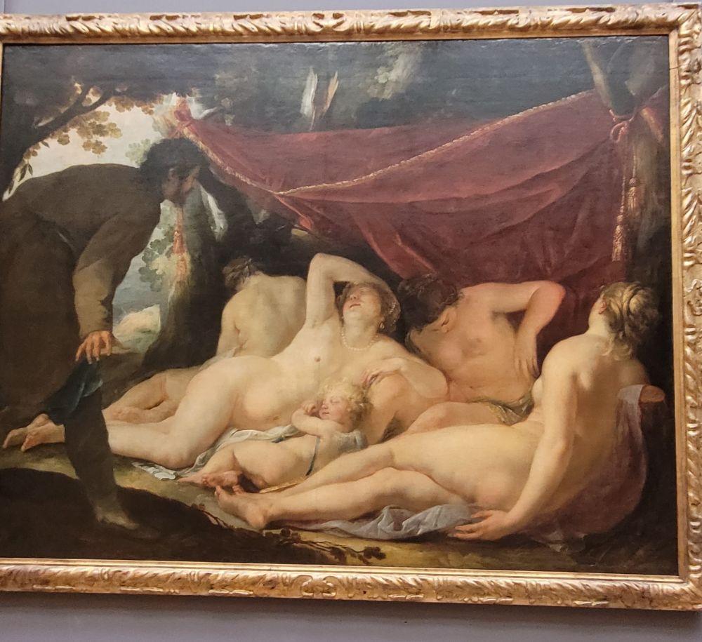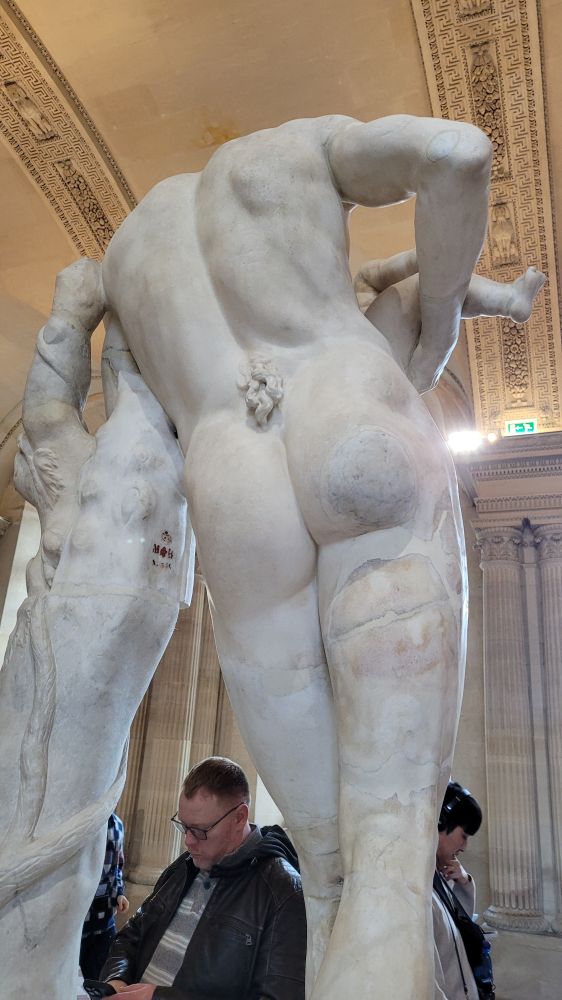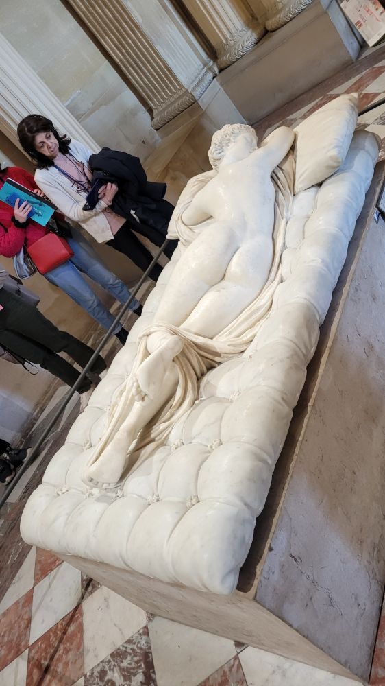 《沉睡的海尔玛弗狄忒》(Hermaphrodite endormi),这个卧着的美女,从另一侧看却同时有男性和女性的性征,而且男性特征还是aroused,少儿不宜,没办法贴出来。想想这个概念是在1692年就被人玩坏的。太阳下面没有新鲜事,现在能有啥特立独行或者说标新立异的说法和做法呢?那个阿姨看的表情就可见对现代人还是有惊异到。^_^。