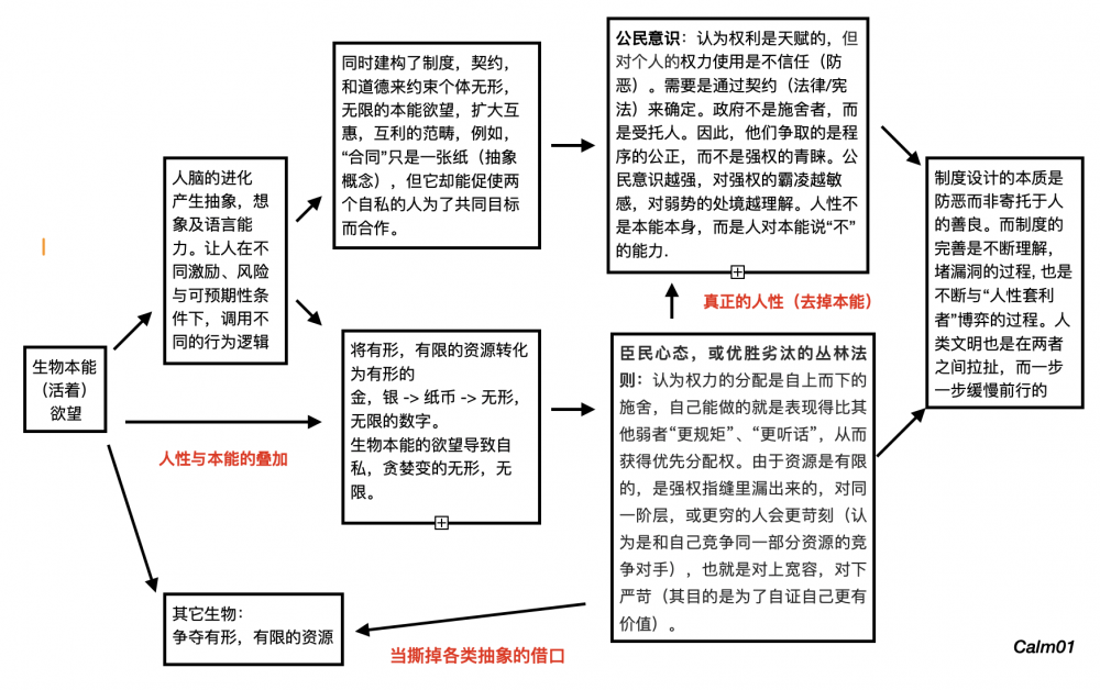 人性的起点和其它生物一样,活着,将基因传下去。这是生物的本能,每个人都无法逃脱。但人类大脑的进化赋予了我们不一样的能力:即抽象思维、想象力和语言能力。正是这些能力,让我们可以超越原始的生存竞争,尝试在混乱和欲望之中,建立一种不会彼此伤害到无法共存的秩序。