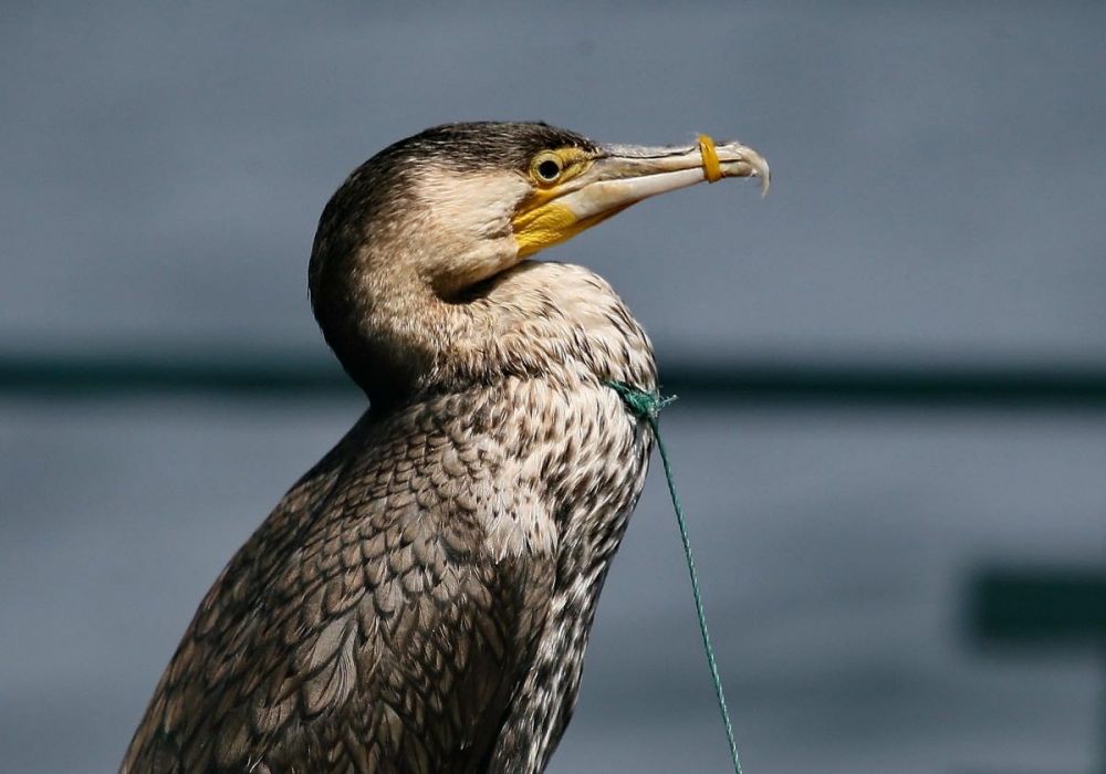 这就是鱼鹰的特别之处。鱼鹰何尝不想吃下它辛苦捉到的海鲜呢?只是因为每只鱼鹰的脖子上都会被鱼鹰的主人用辫子细绳绕一圈系(ji四声)住,位置就在鱼鹰食管处储存食物的囊——俗称嗉子——的上面。嘴里的猎物它根本无法吞咽下去了。经过这样精准的管控和训导,鱼鹰只能把叼到嘴里的猎物乖乖带回奉献给它的主人。有的驯养鱼鹰的人干脆弄一个铁环直接套在鱼鹰的脖子上,如此卡住它的喉咙的通道,既足以应付又卓有成效。