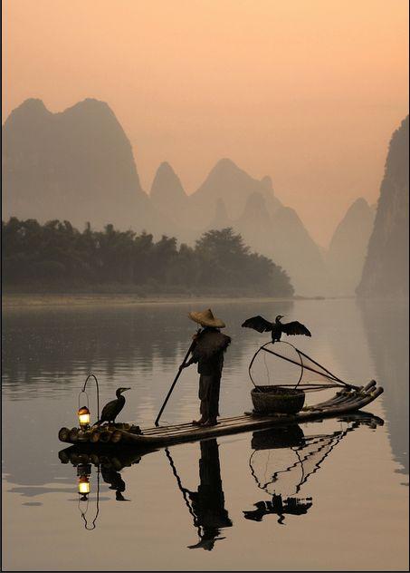 可怜那些悲催的鱼鹰,正孤寂地站在“放鹰人”的船头,茫然地望着水雾凄迷的远方……