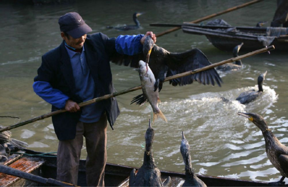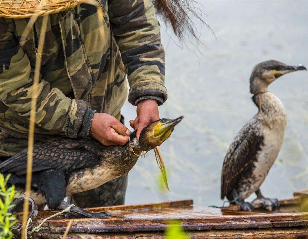 捕捞作业收工后,鱼鹰的主人给它们喂一些小鱼碎虾。为了保证鱼鹰捉鱼的效率,放鹰人不会让那些鱼鹰吃饱。所以被驯化的鱼鹰虽然尽心竭力地为主人效劳,但一生仍然都达到半饥饿状态。