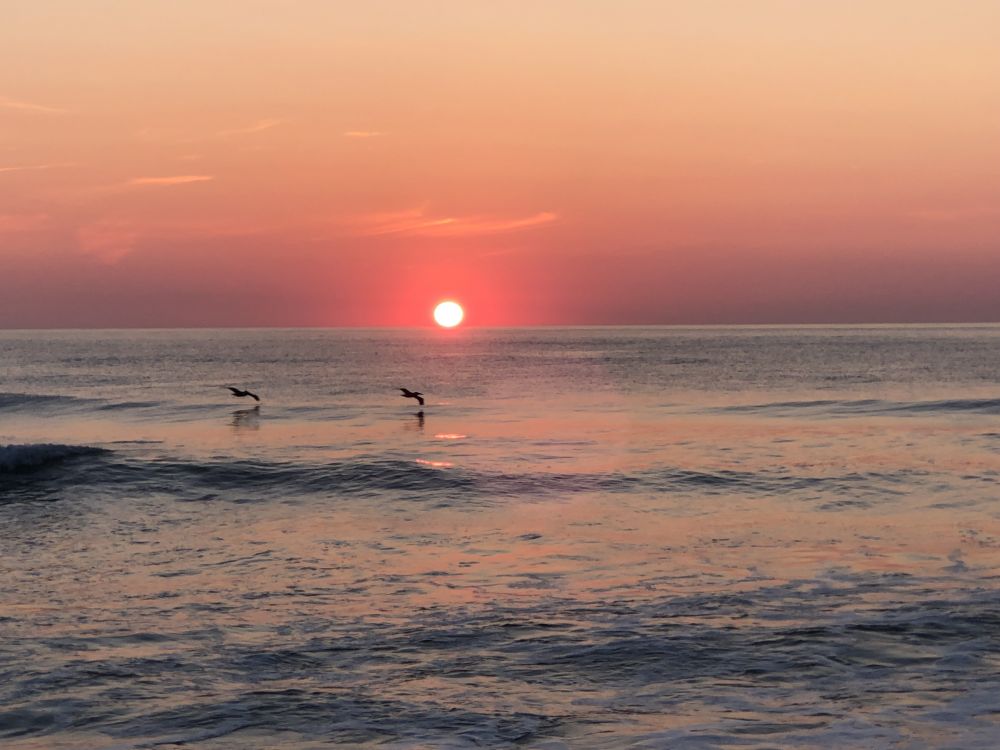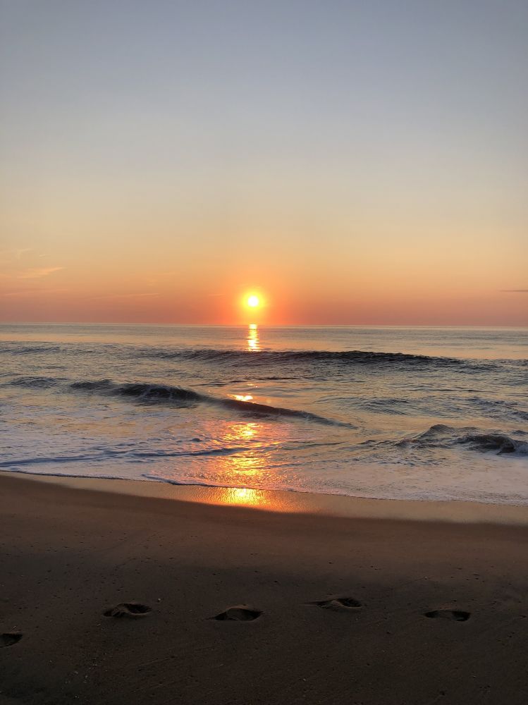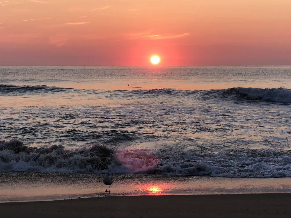2021七月初,度假Virginia Beach. 晨起观日出,归途,见冲浪手若干,或浮于水,或立于岸,待浪而奔。遂口占一绝,后补下阙成律。