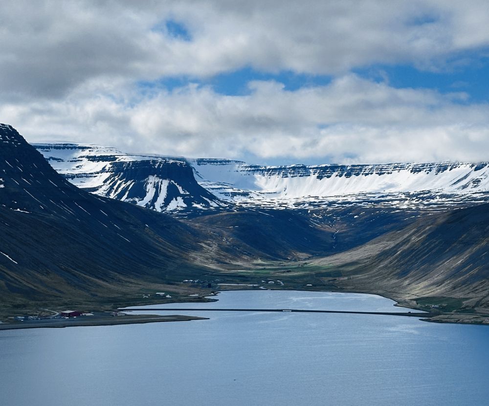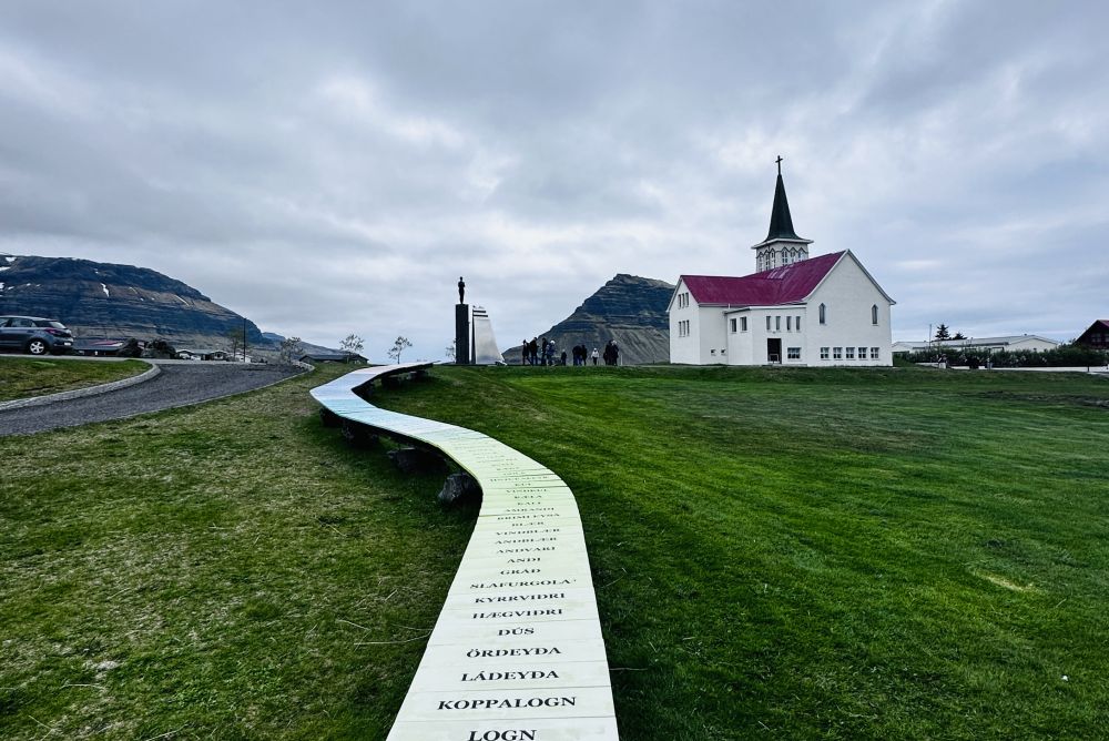 邮轮继续航行一夜,第二天早上停靠在Grundarfjordur, 冰岛西部海岸一个只有800人的小村子。下船后,我们徒步去附近的瀑布,在一条毫不起眼的小水沟上,没法和其他地方的大瀑布相提并论。我和体力好的朋友继续往教堂山方向走, 这座只有460多米的小山坐落在海湾旁边, 山势陡峭险峻, 因其形状而得名。山底坡地被几处民宿圈地占领了,小路旁树起了Private Property 的牌子,当我们正在犹豫要不要穿过民宿上山时, 就听到有人远远地挥手吆喝,制止我们进入私人领地, 我们只得从旁边的山坡另寻上山路径。苔藓和野草丛生的坡地崎岖不平,踩上去软绵绵的像厚实的地毯, 在上面行走并不难。来到山腰的一处观景地,我们驻足眺望海湾与雪山景色,眼前一幕犹如仙境画卷。