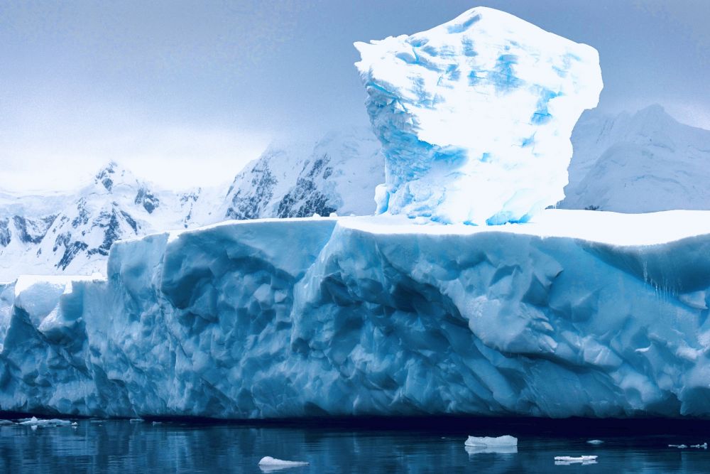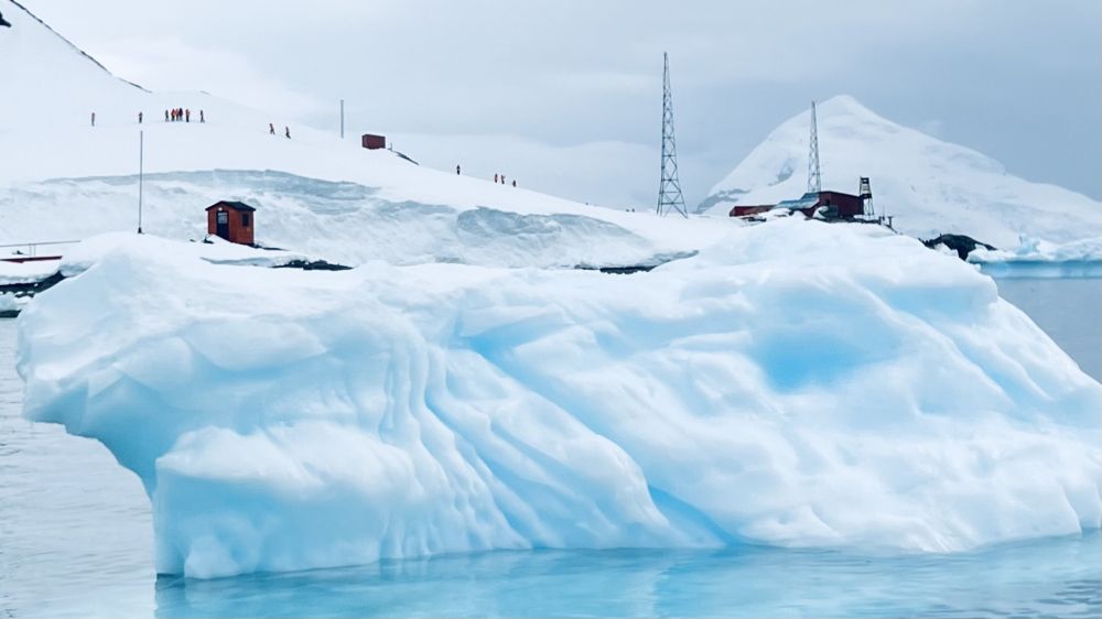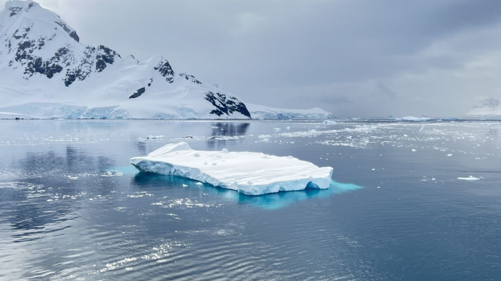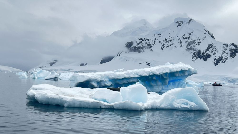 根据安排,我们不能攀登到顶峰。在半山腰必须返回下山。重新乘回冲锋舟,我们并不直接返回游轮,而是要巡游。在冰山冰海里,乘着小艇巡游,近距离接近冰山冰块冰水,味尝南极寒荒之味,激动得心都要跳出来了。小艇沿着岩石海岸线行驶,在悬崖峭壁前暂停。大家手上的镜头齐刷刷都对准了高耸的悬崖。那里有成群的南极鸬鹚,雏鸟毛茸茸的,棕色的皮毛还没有蜕皮。鸟儿们在陡峭的栖息处叽叽喳喳,逍遥自在,令人印象深刻。当然我们还遇上了两头食蟹海豹,懒洋洋地躺在冰山上享受。还不时地用前肢当扇子不停地扇着,同船的队员开玩笑说,它太热了。我们的小艇在海面上不停地巡游,在淡绿色的冰山旁边,每个人想方设法找到最好的角度记录冰海冰景。按规定,在冲锋艇是不允许站立的,但渐渐地为了拍摄,一个个都站了起来,开船的探险队员说,没关系,你们都穿着救生衣,掉到水里,救生衣会自动打开,没有生命危险,就是有点冷。说得大家开怀大笑。随机碰到的一座又一座的冰山,它们到底有多大,沉在海里到底有多深,谁也不知道。在我看来,这厚厚的大米粉一样白的冰山,像极了小时候过年做年糕的年糕粉。真的太惊讶了,同样是两个氢一个氧,在这里怎么可能积成这么厚呢?!杜甫说,"窗含西岭千秋雪",千秋雪,已经称古雪了。可这里,美得令人窒息的冰雪美景,到底有多少个"千秋"才能累积而成啊?置身其中,才知道什么叫冰山一角。