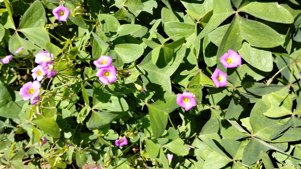 注:阔叶酢浆草,多年生草本植物,三叶草类,基本属于球根花卉范畴。地下部分有贮藏营养的鳞茎或块茎;茎干纤细;叶三角形、鱼尾形或心形,三叶互生成六角形;花细小、粉红色,五瓣;花蕊鹅黄色。喜欢温暖、湿润和阳光直射的环境。此种植物澳洲极为常见,常视为侵入性物种或是杂草,难以根除。其实我觉得在花园一角有那么绿油油的一片,作为观赏植物,感觉也很不错。