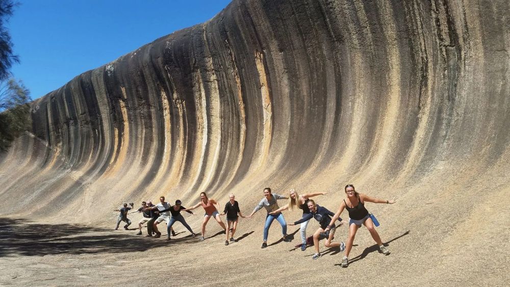 注:澳大利亚波浪岩(Wave Rock)位于西澳西南部内陆地区的小镇海登(Hyden)东郊,距离西澳首府珀斯(Perth)约335公里。波浪岩是自然形成的一块花岗岩石,露出地面的部分占地几公顷,高约15米,长约110米,岩石上一条条红褐色、黑色、黄色和灰色的条纹在阳光映射下艳丽非凡。波浪岩是经过27 亿年的风雨侵蚀而形成的花岗岩地貌。