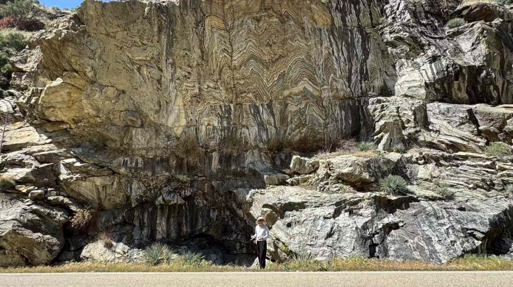 注一:帝王谷(Kings Canyon),典型冰川地貌,谷长六百多公里,谷深逾1600米。位于内华达山脉南翼,加利福尼亚州东部,系美国西部科迪勒拉山系的一部分。图中景点所示系中生代三叠纪或侏罗纪片岩、片麻岩。原岩系沉积砂岩。这里褶皱发育,断裂丰富,构造风景蔚为壮观。这一带是太平洋板块与北美板块接触碰撞的地方,周围有火山侵入岩体,应该是高温挤压变质的产物。