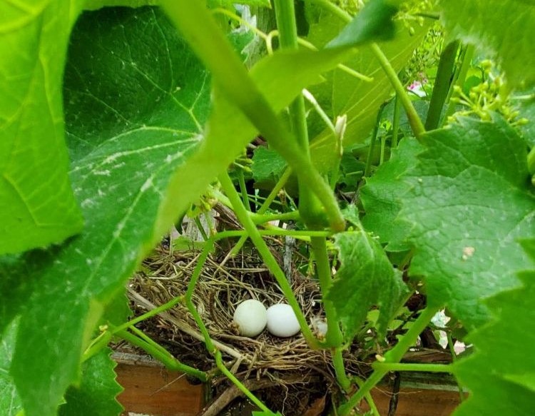 葡萄不仅自己繁枝叶茂, 还为其他鸟类提供了生存的场所。一天给葡萄剪枝, 发现葡萄叶子有一个鸟巢。鸟妈妈正在外边寻找吃的, 两枚鸟蛋静静地等候在家里。阳光透过葡萄绿叶洒进来, 鸟蛋熠熠生辉, 一幅天然绘出的画卷述说着对生命的企盼!