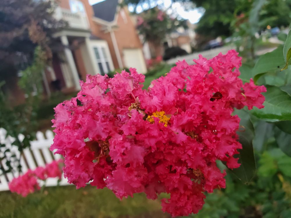 毕竟有些先天不足, 很快一棵紫薇树上长起了白瘢, 树枝变成了黑色的。我以为是霉菌, 赶紧把上枝砍掉, 留下根部等待来年。这棵顽强紫薇树, 第二年就抽枝繁叶, 追上了其他的小树的高度, 开出了同样艳丽的花朵。