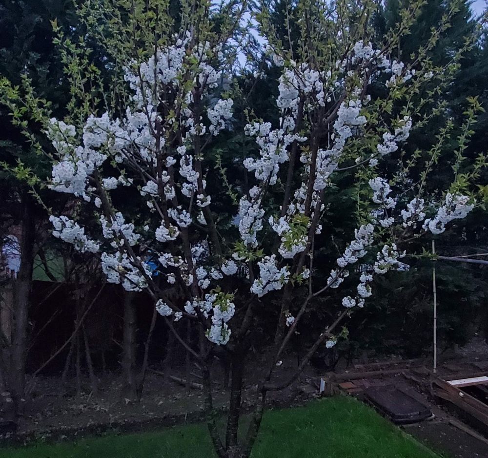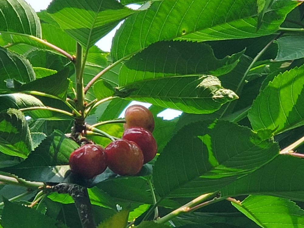 春天来了, 两棵树开花了, 紫红樱桃树开了十几朵花, 而黄樱桃开了好几百朵。 辛勤的密蜂在两棵树之间忙个不停, 让花朵们互相授粉, 一朵花一个果, 今年一定是个樱桃丰收年。不过我知道, 后院还有几对小鸟夫妻, 总是唱着歌儿, 同行飞翔在樱桃果实之间。樱桃熟不熟, 小鸟先知道。说不定那一天熟了的樱桃会随着小鸟同行远飞, 樱桃把自己甜美的果肉分享给小鸟, 小鸟则飞的更远, 把樱桃种子撒在田间山野之中, 又是一曲生命相逢和同行的歌。