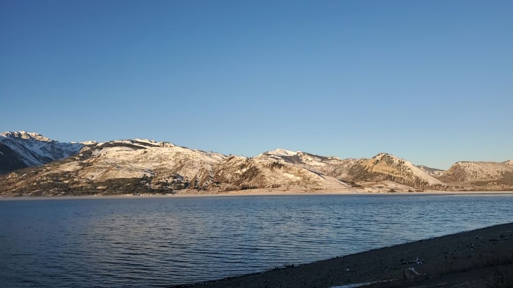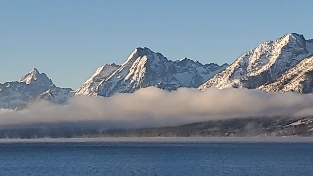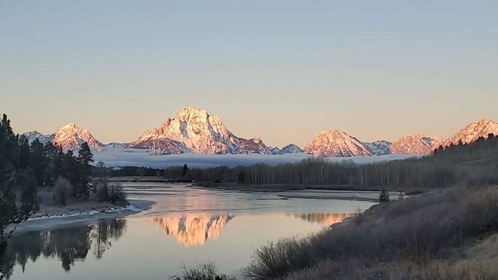 第二天一早,天还没亮,我们开车上路,又向大提顿公园驶去。清晨的温度是华氏10度上下,水已结冰,空气格外透澈晶莹。初升的太阳躁动起来,喷薄而出,霞光万道,毫不吝啬地把自己的光芒打在连绵不断的山峰上。瞬间,皑皑的雪山变成了灿灿的金山;不遑多让的湖水更把金山的倩影拦在怀中。那一道缭绕的晨雾是不是那位的仙女留下的温情? 我遐想起来,一时不知道自己是在天上还是在人间。