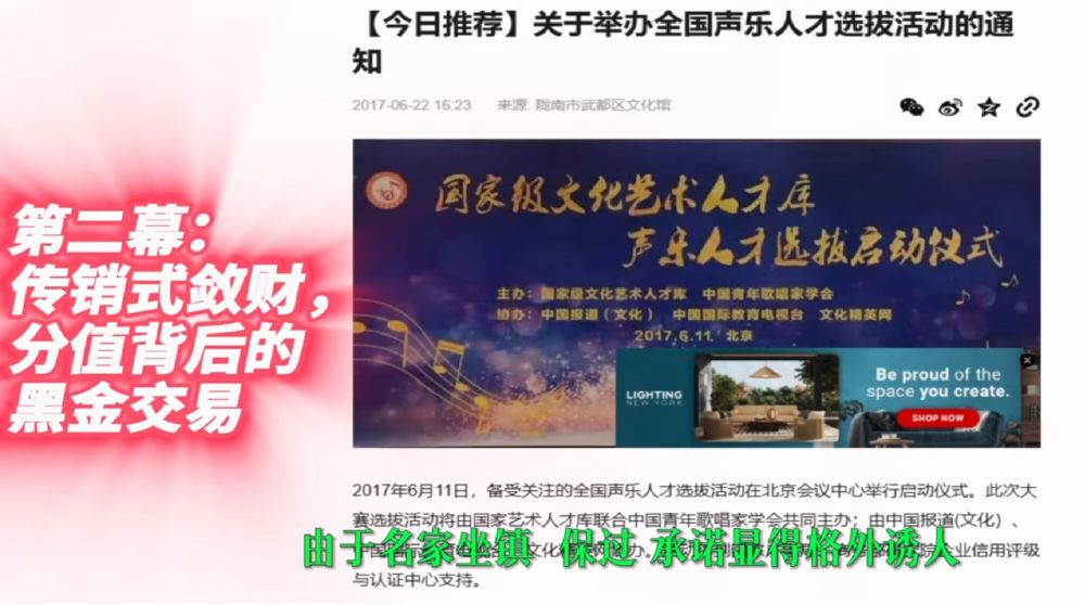 2017年,干儿子伙同舅舅在北京会议中心开启“声乐选拔”。舅舅亲发聘书,拉拢多位著名歌唱家、声乐教授站台背书,利用名家光环欺骗数万学生报名。