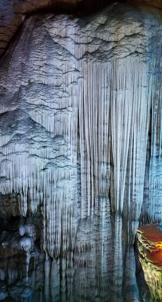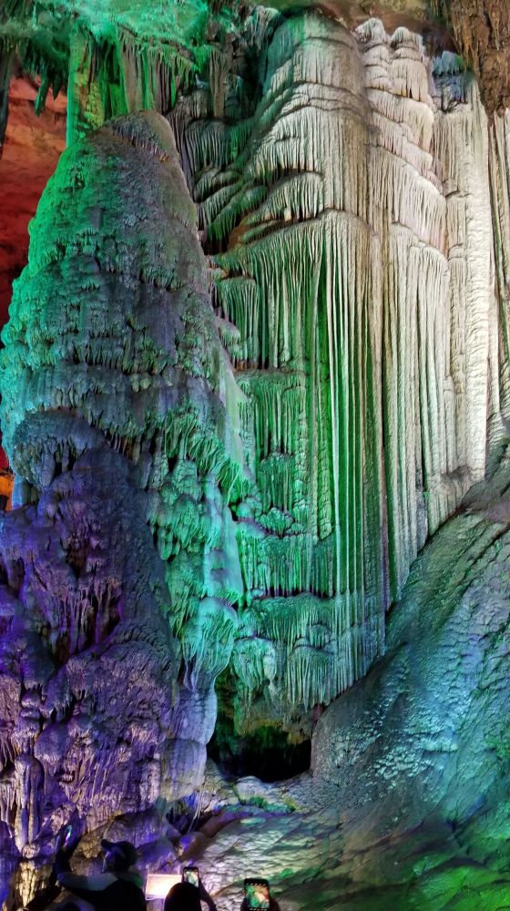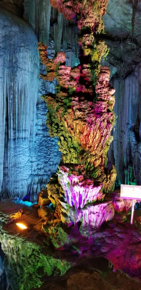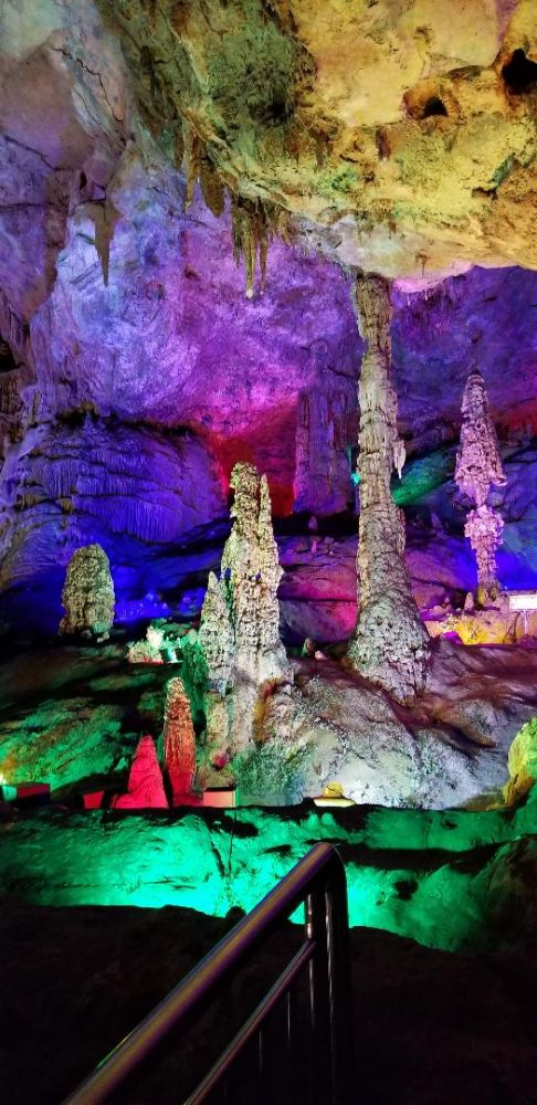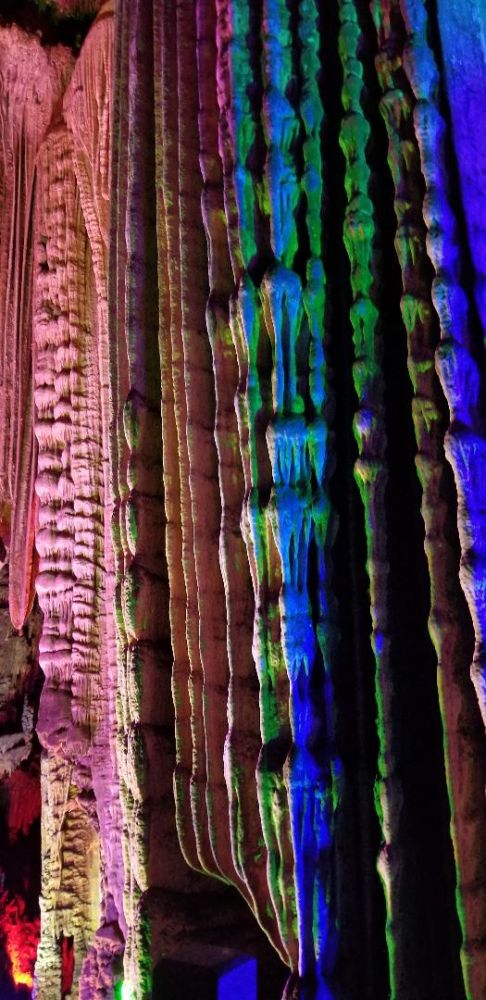 银子岩离阳朔挺远,在桂林的南部,属于荔浦县,荔浦芋头可是以粉,糯,香,甜出名哦,可以去尝尝荔浦芋头鸡。银子岩洞是一座千姿百态的钟乳石岩洞,比芦笛岩大很多,1996年才开放。银子岩洞内汇集了不同地质年代发育生长的钟乳石,闪烁出似钻石的光芒。银子岩洞是典型的喀斯特地貌,贯穿12座山峰,其钟乳石像银子似钻石,晶莹剔透,洁白无瑕,在灯光的照射下,折射出银子般的光芒,故称为"银子岩"。其钟乳石比芦笛岩的钟乳石要壮观的多,你会被自然千年的变化而震撼。许多一支独立象定海神针的钟乳石,千树万花色彩缤纷的熔岩,散发出银色的卷帘熔岩,形成独特的洞中有湖,湖中有洞的仙境。前面我说过也许每个人的审美和感悟不一样,我最喜钟乳岩洞。科普一下,喀斯特地貌即岩溶地貌,是水对可溶性岩石(碳酸岩石,石膏,岩盐等)进行以化学溶蚀作用为主,流水的冲蚀,潜蚀和崩塌等机械作用为辅的地质变化,经过千年的变化形成的美丽奇观钟乳石,身在其境你只有哇,哇,哇的感叹声! 桂林山水,阳朔风光主要是以石芽,石林,峰林,天生桥等地表喀斯特景观著称于世,并且是山中有洞,洞中有湖,美的眼花缭乱。太多的岩洞了,七星岩,伊岭岩,都乐岩,莲花岩,兴安乳洞,永福白寿岩,宜山白龙洞,凌云水源洞,龙州紫霞洞,丰鱼岩,有的溶洞都可以坐小船游览。太奇妙了! 各位看官,读了我的科普您是不是也心动了噢? 心动就要行动噢! 满满的祝福送给不厌其烦读我微信小博文的您! 有位小朋友告诉我写小文最好在100个字以下,他可以有耐心读完,呵呵少年人可以理解,不过还是谢谢您喜欢我的文字!
