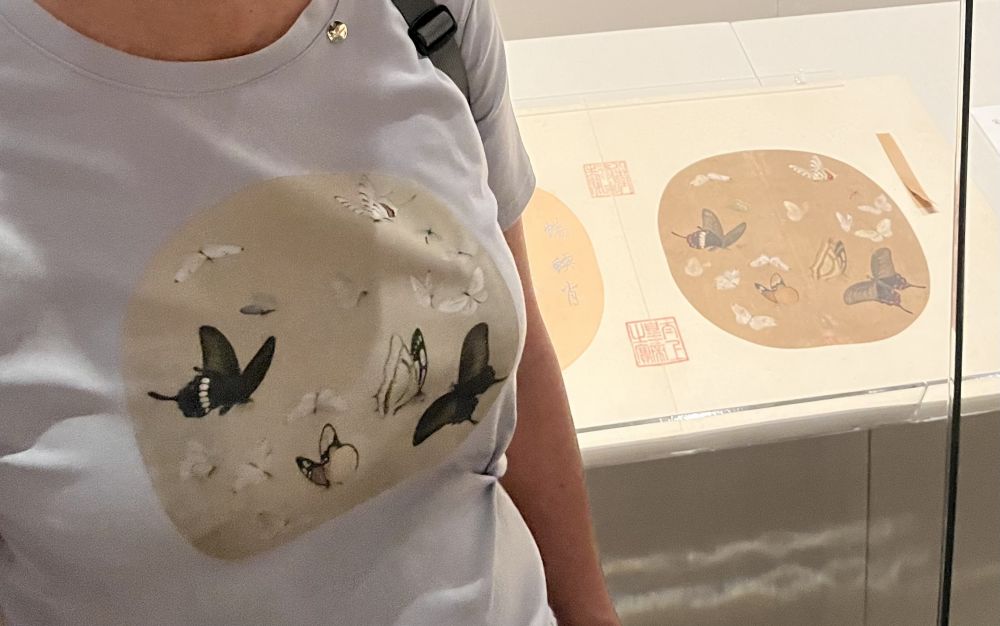先生站着说去过许多国家博物馆,从来没有见过这番景象。不由感慨中国地大物博,人口众多,历史悠久……3个小时过去了,也只看了中国通史的三分之一。下一个节目是和老朋友在东华门碰头,参观故宫的一个特展。正午的烈日当空,天安门广场依旧人头攒动,要知道所有的人都是通过预约验名正身,才得以行走在这神圣的地方啊!难以置信全国人民对这里的向往……在东华门和老朋友汇合,尚教授的弟子们在宫内行走,我们借光走后门进入宫中。去参观一个皇家藏品书画中动物的展览。惊喜地发现我身上穿的一件汗衫(刚在西安买的),上面印的一幅蝴蝶图,竟然也在展览。也许天气太热有点中暑,居然吐了(还好吐在院子里),可巧一直带在着的神药藿香正气胶囊不在身边。由于没有及时吃药,在吃晚饭的时候又一次忍不住吐了。尴尬至极,我让先生去附近买药,还是尚教授有办法,他请餐厅经理用手机订购了同仁堂的藿香正气水,25分钟药就送到,马上灌下两瓶,立竿见影,顿时感觉好多了。
