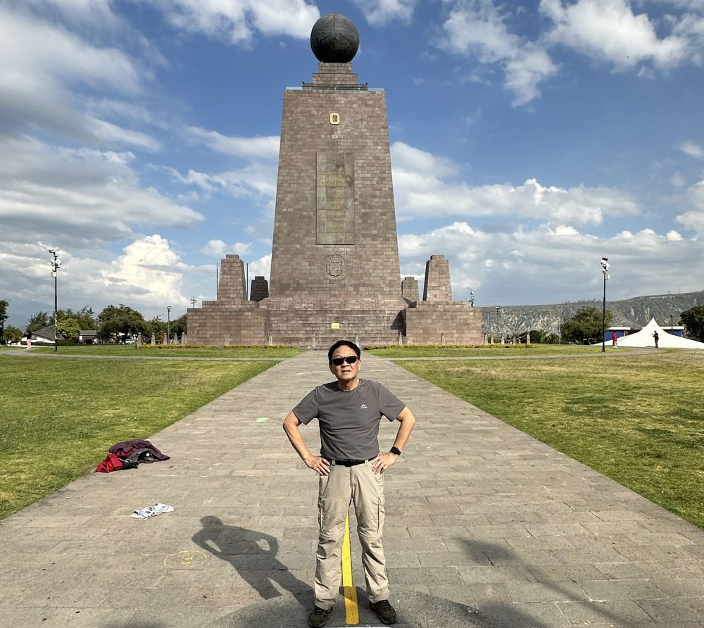 厄瓜多尔的国名正是西班牙语的赤道的意思。赤道从基多穿过,这又是厄瓜多尔一个亮点。我们来到Intinan博物馆,是一个不大的露天博物馆,非常有趣、偏科学体验型的“赤道博物馆”。穿过其中的赤道,把博物馆也分成南北半球两部分,解说员还做了不少演示,流水实验,立鸡蛋实验……有点哄小孩的味道,但我们还是乐此不疲的试着把鸡蛋立在螺丝钉顶上。临近博物馆还有一个称为Middle of world 的纪念碑,你可以站在赤道线上,脚跨南北半球,留个影。也可以坐电梯登上塔顶,环视四周的火山。实际上赤道(Equator)是一条假想线。是地球表面纬度为 0° 的大圆。在科学和地理定义中,没有物理宽度。然而气候或生态学中常说“赤道带”通常指 纬度 0° ± 5° 或 ±10°,这可能相当于 数百到上千公里宽,那里没有台风等灾害。由于临近赤道,四季温差小。气温主要由海拔高度决定。尽管天气不太热摄氏24-5度,吹着小风,体感温度不高,但紫外线辐射很强,必须用防晒霜。在这些景区感到旅游观光客不多,偌大的园区空空荡荡,餐厅更是门可罗雀。