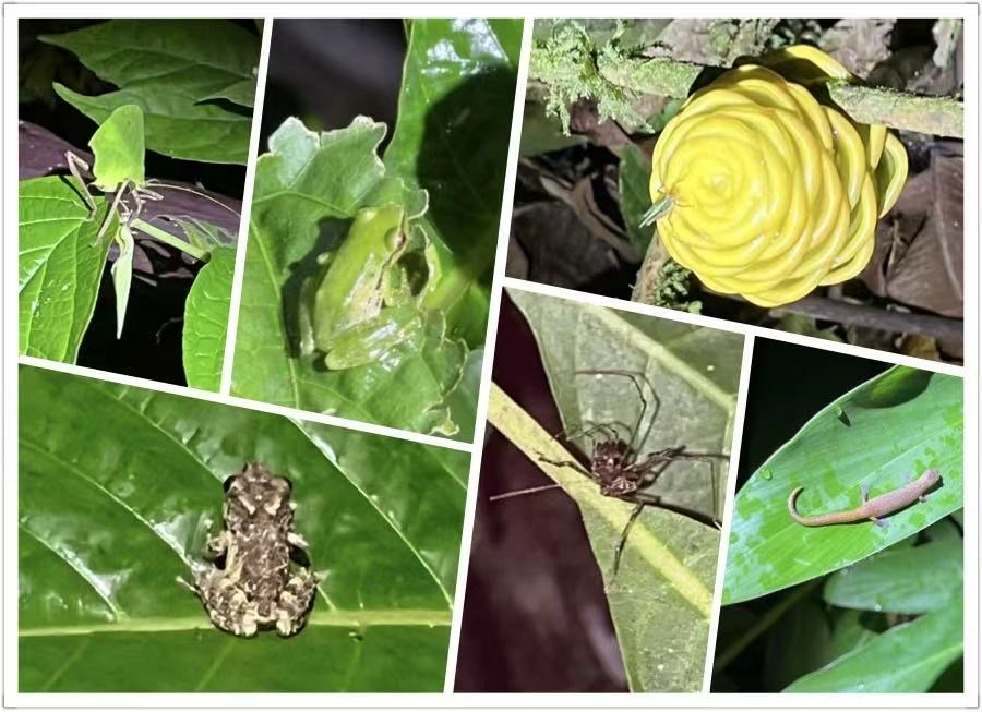 天黑后我们自己持手电在家门口走走,寻找动物。看到一群蚂蚁,每个头顶一小片树叶,列队从树干上爬下来,我们沿着它们的轨迹,只见它们有条不紊朝一个方向行进,延绵足有4-50米,整整齐齐的队伍,越过小路,爬上坡,消失在灌木丛中,相反方向的蚂蚁都是空手,显然准备下次搬运,实在太可爱了。第二天早上,我沿原路寻去,一只蚂蚁也没有。我们请教导游这次夜间行动,被告知,蚂蚁把这种树叶搬回窝里,待树叶长出蘑菇,蚂蚁吃蘑菇。多么神奇的食物链啊。(有录像,但无法上传,大家只好想象一下了)。