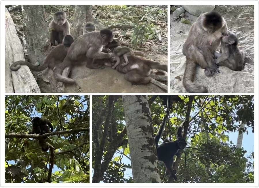清晨被婉转动听的鸟叫唤醒,推门看到大滴露珠从房檐上滚落,空气清新,又是一个好天。这天的活动是的到雨林去看猴子。我们厄瓜多尔的雨林是亚马逊雨林的边缘地区,据说物种非常丰富。开车将近一小时,来的亚马逊河的一条支流,坐上独木舟,地陪带我们划入小河汊,水色发黑,一群群红色的既像蜂又像蝴蝶的动物,在水面上飞舞。各色鸟儿不时从岸边树丛飞出了,导游讲解着名字,实在太多了,记不住了。我们登上一个小岛,马上被猴子吸引住了,黑色的蜘蛛猴体态高大,吊挂在树枝上打秋千,几个小个子的棕猴上串下跳,还有几个猴子一点不怕人,下树来抢导游手里的香蕉……,导游说共有五种猴子在这里生活。树上有个直径约一尺的大蚁窝,导游引出一些,揉碎,据说可以食用,其气味还可以防蚊。导游砍下一支嫩棕榈,剥开抽出嫩叶,这是一种很柔韧的纤维,就是编织巴拿马帽的材料(其实巴拿马帽产于厄瓜多尔),也用于茅屋的屋顶,土著人的草裙……回到小舟上,划过一丛树枝,发现上面是个鸟窝,一个头上有羽毛的母鸟正在孵蛋,我们又划回去看个仔细,被告知叫麝雉(Hoatzin),是一种古老的的鸟,妈妈的职责使它瞪着眼睛,安安稳稳坐窝……。