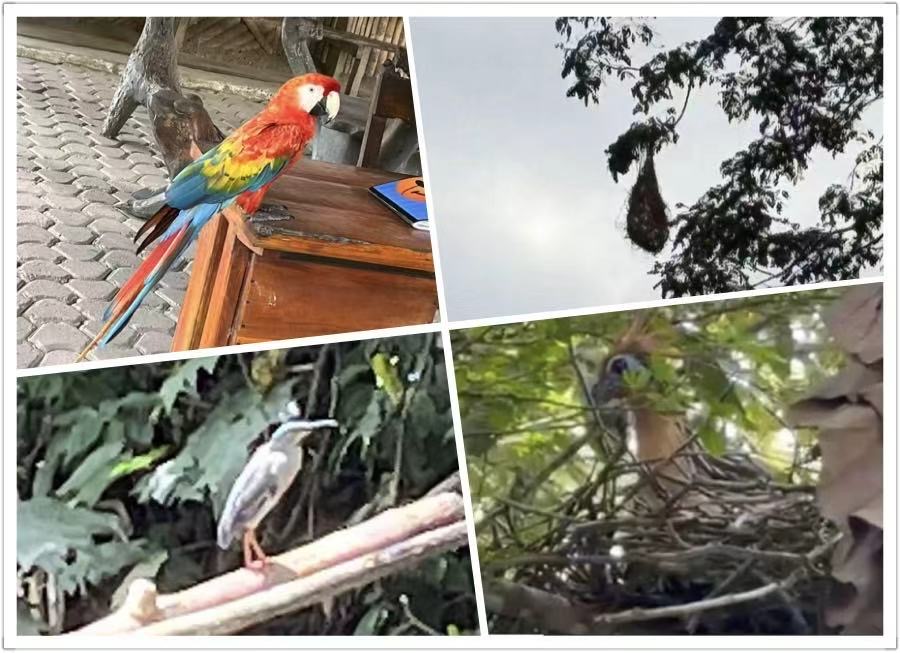 早上的鸟很活跃,我们用望远镜顺叫声寻找,看到一颗大树上挂着两个像网兜一样的窝,黄尾巴的鸟儿,时儿迅速钻进钻出窝,显然是在喂它们的孩子,实在精彩。请Chat GPT为我查名字,叫冠拟黄鹂(Crested Oropendola)。可惜没有高倍望远镜,没有照到鸟的照片。