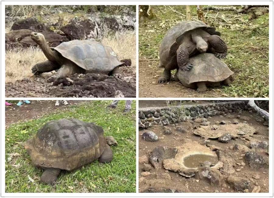 次日清晨我们坐公交快艇到Sante Cruze岛,行驶2小时。这些港口快艇无法靠岸,都需由小艇转运。这个岛面积不大,但居民最多有1万5千人。地陪接了我们直接去了高地。沿途看到路边散在的陆龟。农场里牛群中也有陆龟的身影,加上牛背上纤细的白鹳,好一派和谐共处景象。看了两个火山形成的天坑,也注意到两个岛气候植被的所不同,这个岛的树挂为绿色且潮湿,前一个是干枯的灰白色。陆龟农场里,大约一百多只陆龟自然地生活在这里,一个小池塘,就有十来只。这里乌龟体型更大,圆拱型(穹顶型)甲壳,适应 湿润高地、低矮而丰富的草本植被。我们看见它们像羊一样啃食地上的青草,很是新奇。解说员告诉我们从龟板上识别年龄,一个几乎磨平纹理的龟背就有百岁以上了。现在正是陆龟繁殖季节,几次在路边看到交配的伴侣。产卵时节,雌龟从高地爬向低地,低地气温高,适合卵自然孵化。幼龟在低地长到十五岁左右再爬回高地生活。自然孵化陆龟成活率低,所以科研人员捡乌龟卵,用温箱人工孵化,大大增加陆龟的数量。在参观岛上达尔文中心时才知道,龟的性别是由孵化时的温度决定的。27度多为雄龟,28.5以上为雌龟。我是将信将疑,回来查了Chat GPT得以证实。