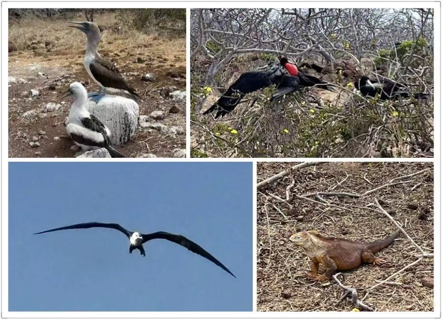 经我们的地陪司机介绍,我们抓住最后一天去了North Seymour小岛 ,面积仅1.9平方公里,岛上无人常住,生态丰富,以多种鸟类闻名。我们加入一个团,坐游艇登岛。一行仅我们三个加两个罗马尼亚的小伙子,一个导游。小摩托艇载我们登岛。小岛平坦,岩石绕着海边,中间多为沙地,树木稀疏伴有红棕色的矮小的伏地植物。也许鲜有人迹,动物完全目中无人,自顾自地活动,使我们可以看到原生态的动物世界。陆地巨蜥颜色远比海巨蜥来的丰富,黄色绿色相间,足有2尺长,瞪着眼睛看着我们(也许Sante Cruze岛海边都是黑色火山石,海巨蜥是全黑色,个头也小一点。)3个小海狮在嬉戏,似乎也更活泼一点。令人难以置信的是幼年的蓝脚鸟一点都不怕人,扑扇着翅膀,摇摇摆摆地冲我们走过来。Fregata在求偶期,雄鸟的颈部会鼓起一个巨大的红气囊,已吸引雌鸟,我们在几个岛上多次看到许多Fregata,从来没有看到红脖子。上岛后,终于从望远镜里看到停在树上的Fregata脖子上的红气囊,让我们激动不已。后来居然可以和它相距仅1-2米,连红气囊边缘的黑点肉眼也看的清清楚楚。我们还看到一家三口同框,树上红脖子雄鸟,雌鸟的脚下一只毛茸茸的娃娃。同时树下一只陆巨蜥立起前肢抱着树枝啃叶子呢。蓝脚鲣鸟(Blue feet booby)妈妈正给一只体型小不了多少的幼雏反刍喂食,幼鸟的脚蹼尚未变蓝呢。天气晴好,蓝天白云,岛上仅有另一组游客。除了偶然的鸟鸣,一片宁静……我们在岛上停留了一个半小时,心满意足,实在是人生难得的体验。