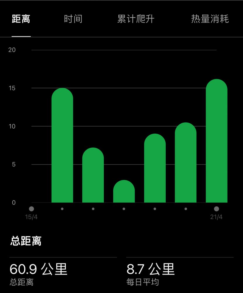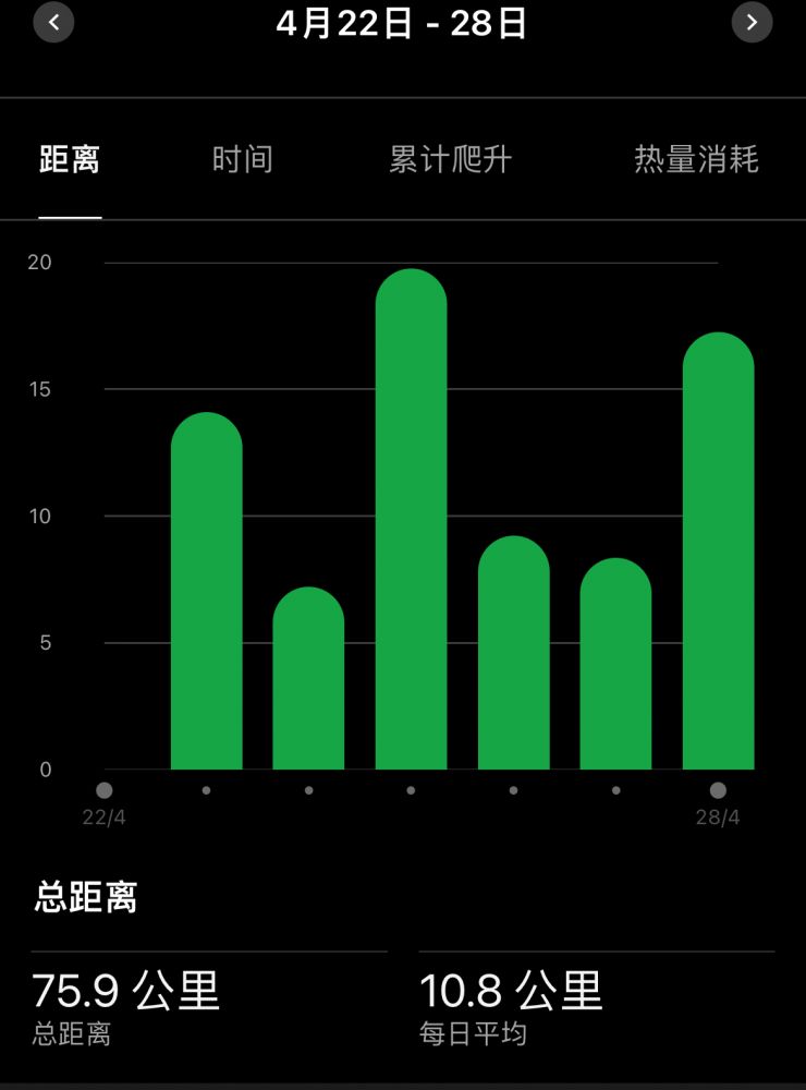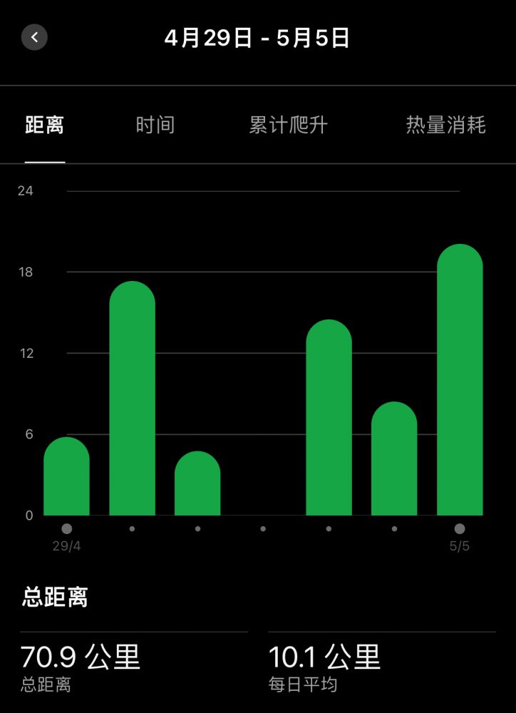 近四周:跑量看,分别15k(04/08-14)、61k(04/15-21)、76k(04/22-28)、71k(04/29-05/05)。每周分别跑二日、六日、六日、六日。最长连续跑九日。共三次完成日二跑,分别是04/25、04/30、05/03。