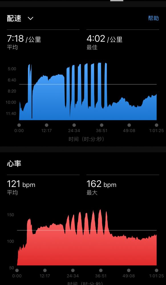 周六:继续好日子:阴天儿、舒服,慢跑热身约20min(lower 心率以及cadence),后续六个约90sec repeats,plus一个30sec stride,20+min放松结束。