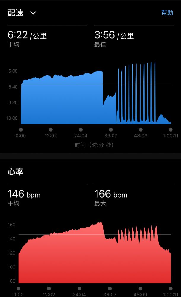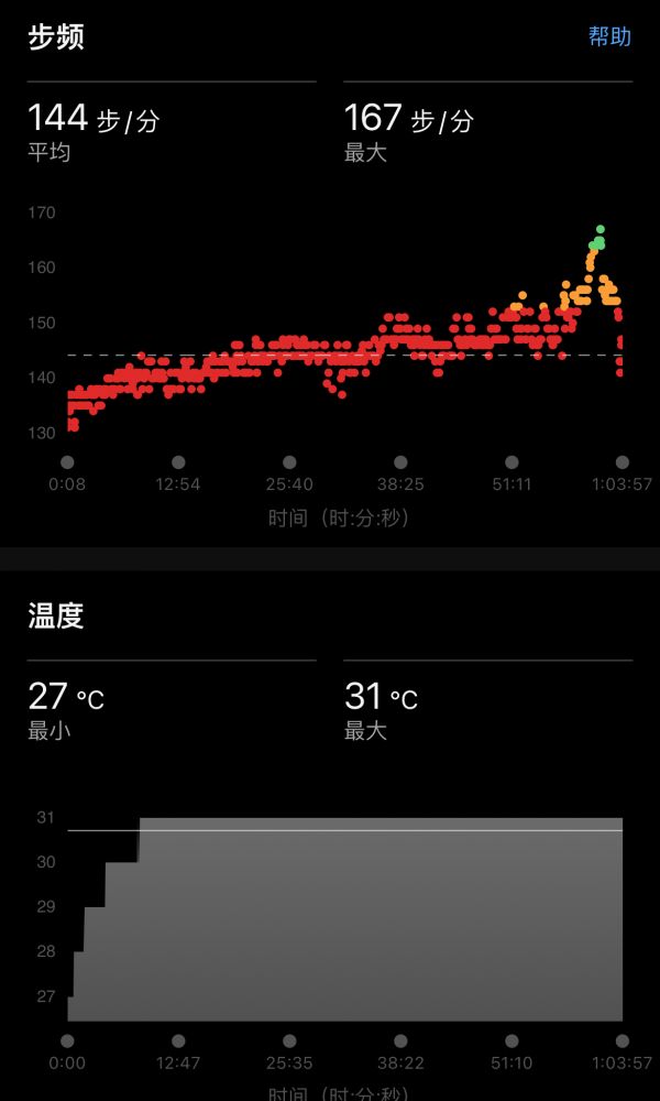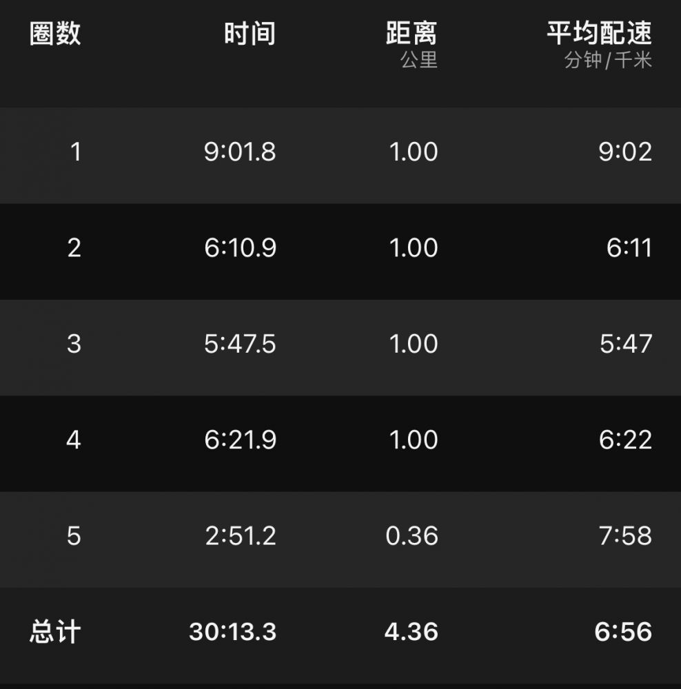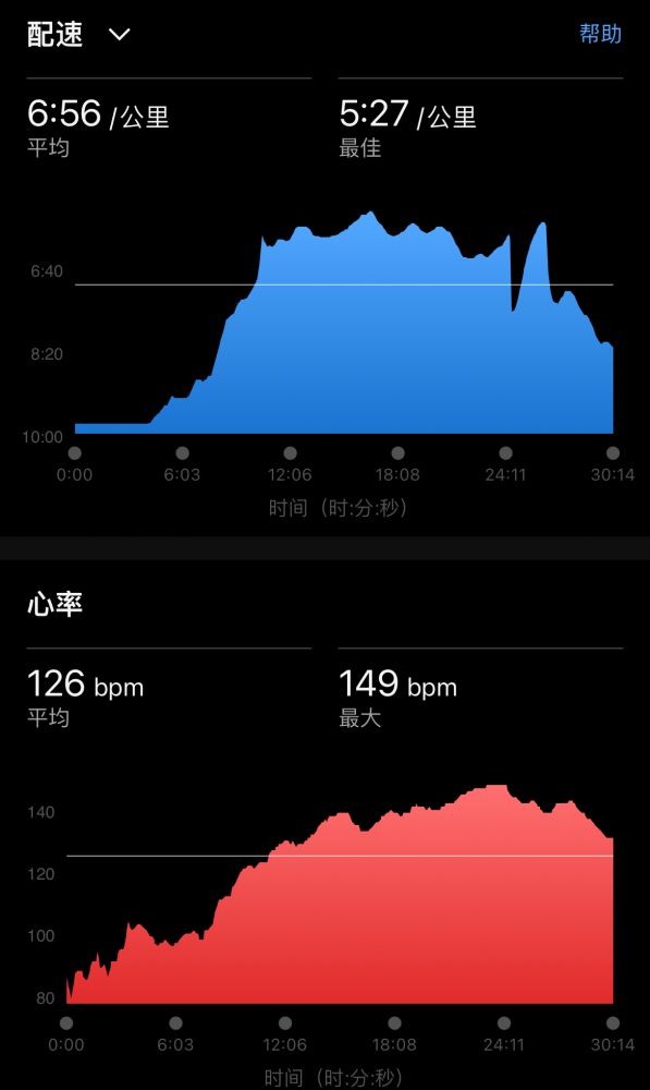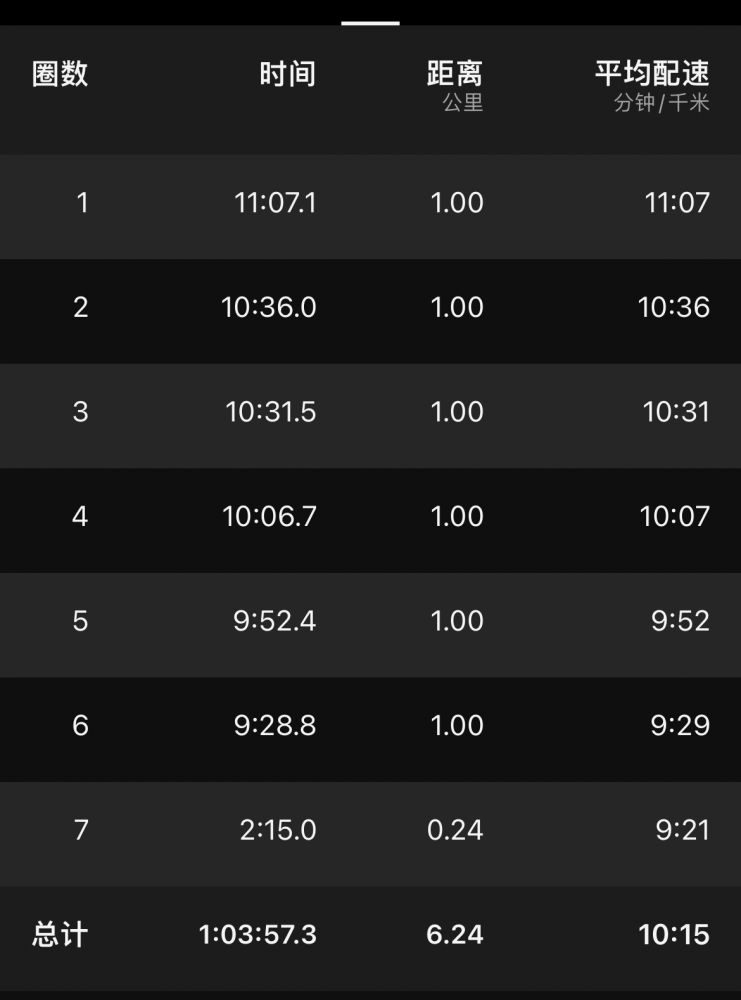 low cadence、low心率,最高速度约9min30sec/km,计1h3m,跑程6.24k。