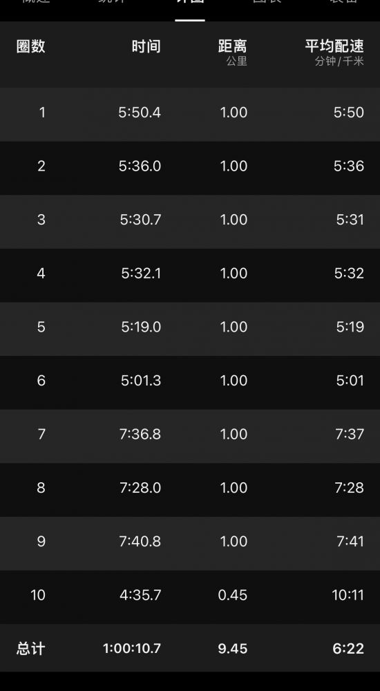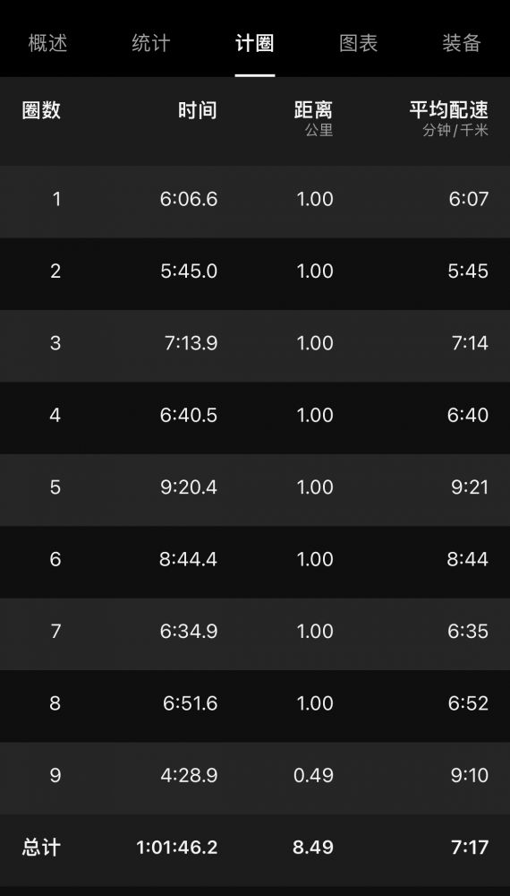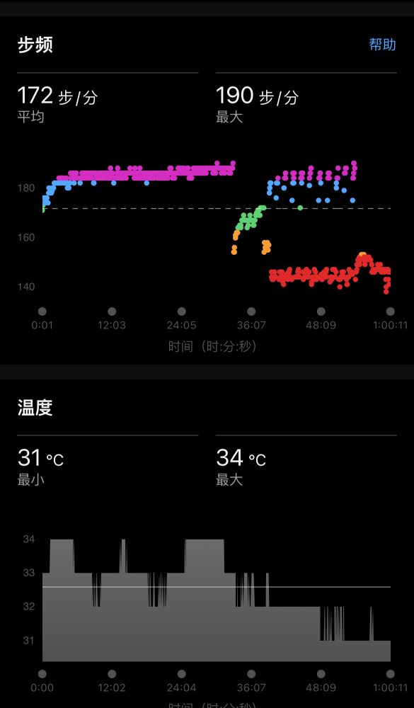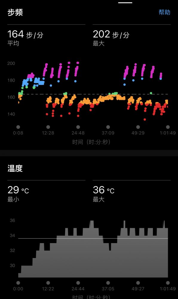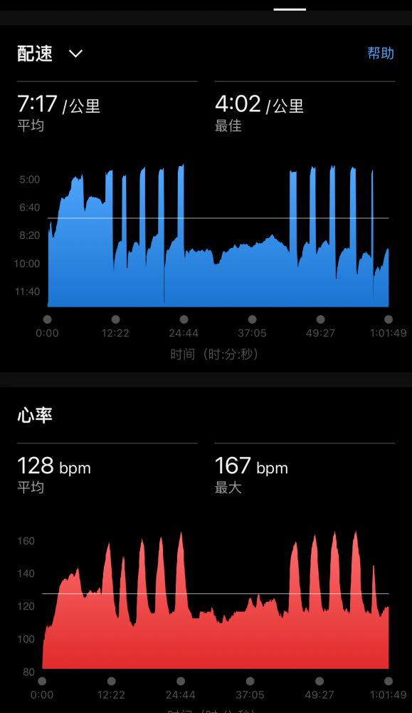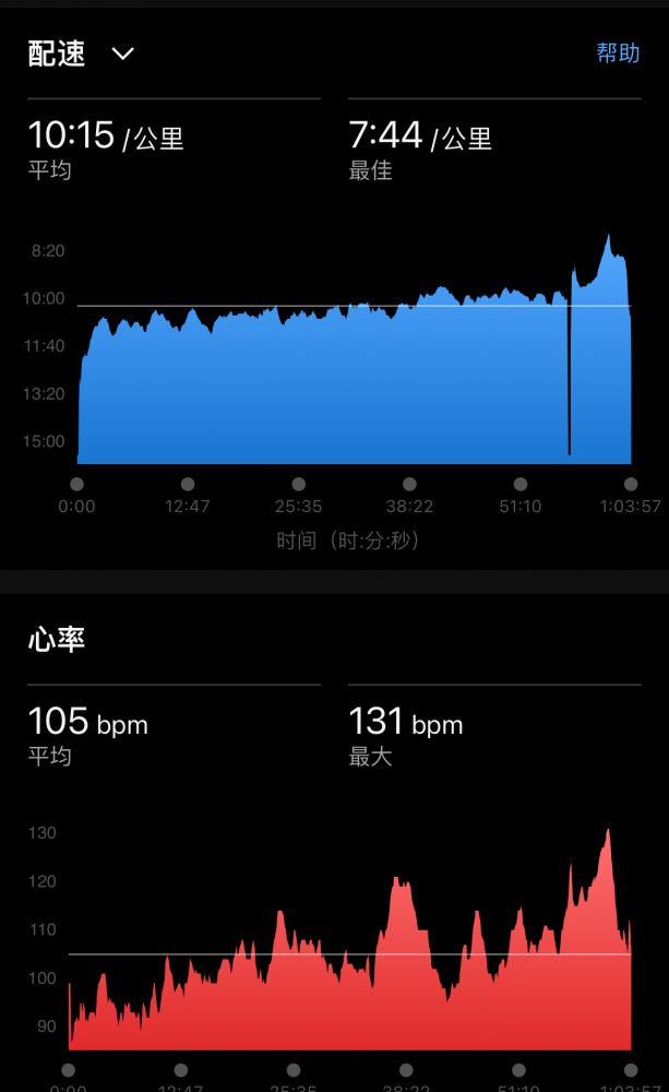 low cadence、low心率,最高速度约9min30sec/km,计1h3m,跑程6.24k。