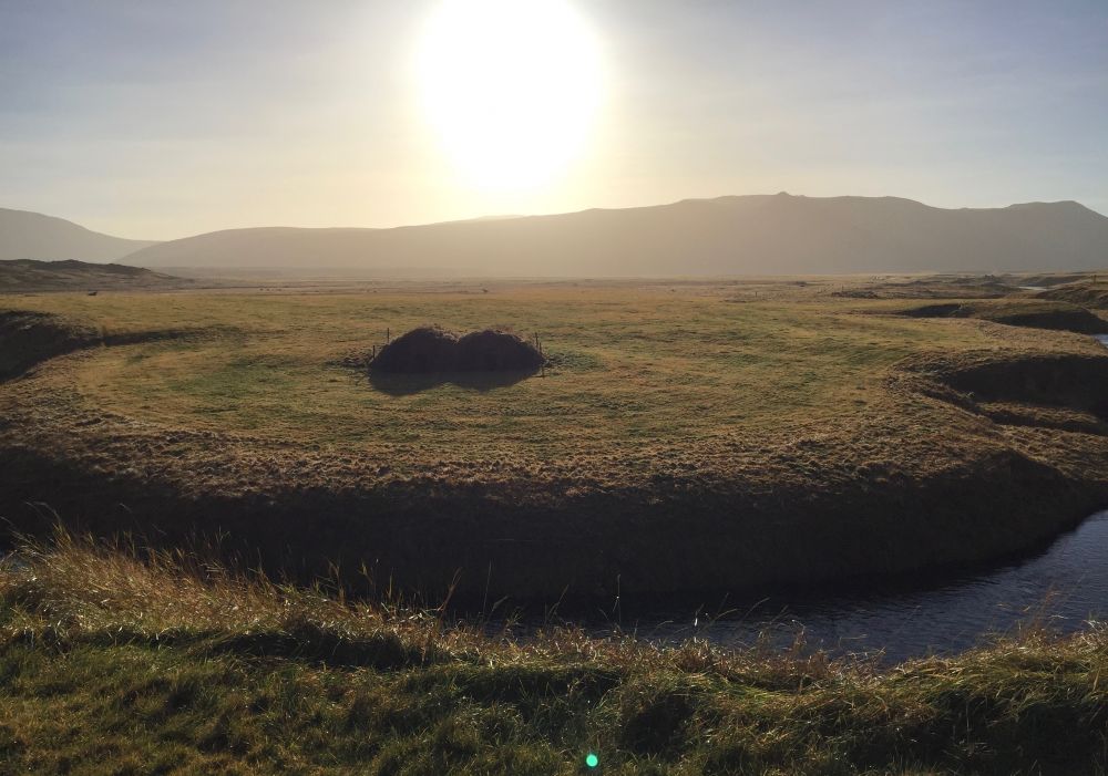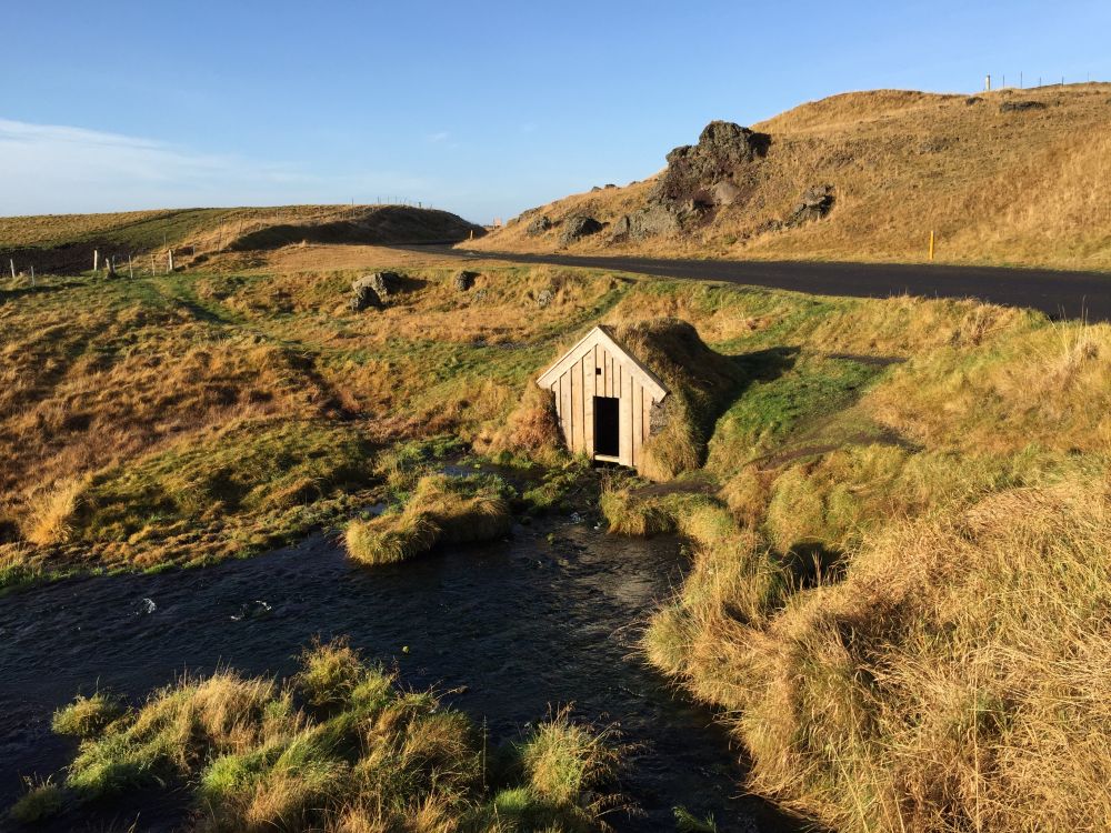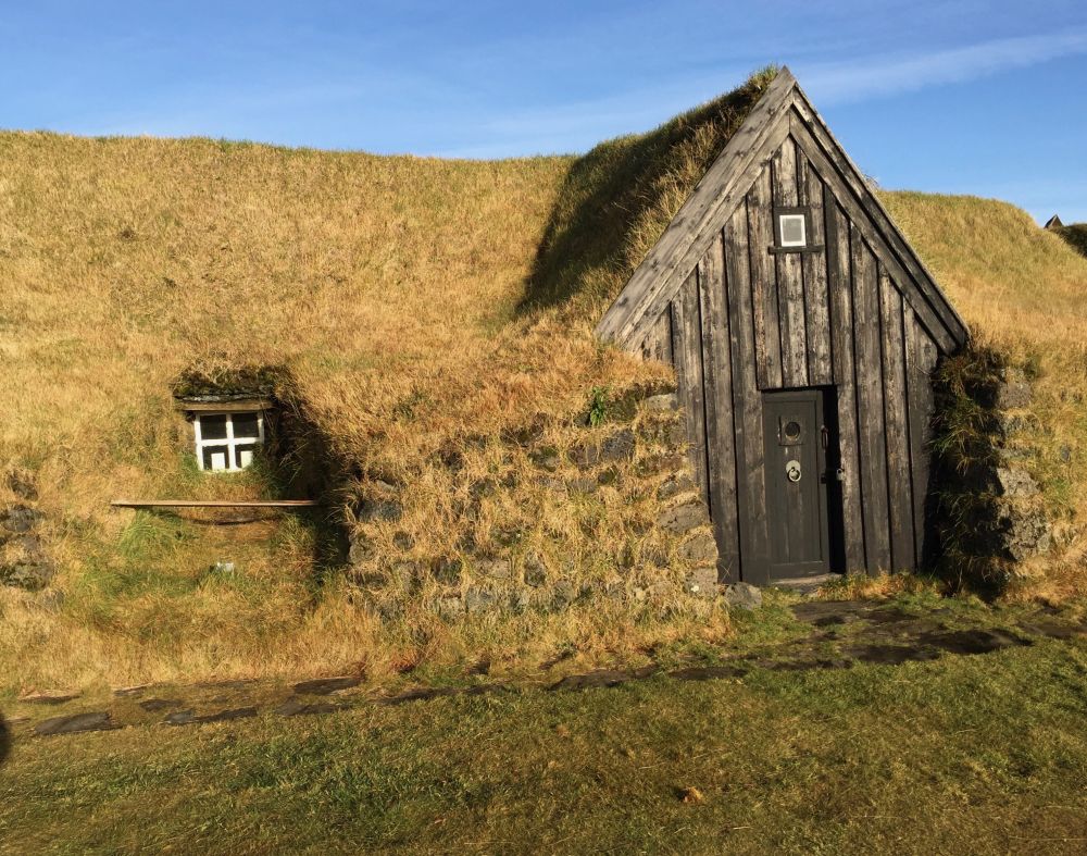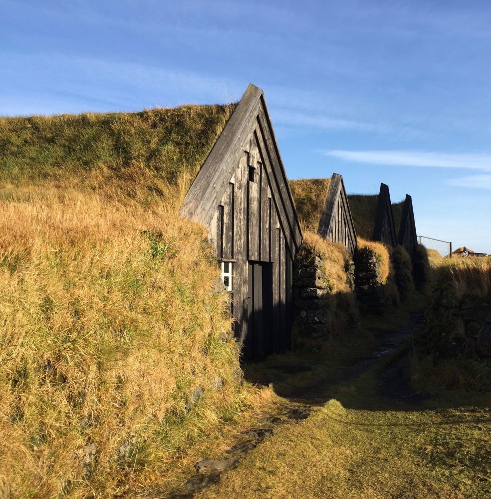 在雷克雅维克停留一天后,第三天早上出发逆时针向东部方向开,继续看南部景点。准备先去斯科加瀑布,差不多两小时的路程。在同一个方向,有一个叫凯尔迪(Keldur )的地方,那里保留了一些最具冰岛传统特色的草皮屋(Turf House)。记得从杂志上看到冰岛的这种草皮屋的时候,觉得那简直就是童话世界里白雪公主和七个小矮人住的小木房子,从那时起,就想来冰岛看草皮屋。所以不能错过,一定去看看。而且又是一个好天,按照GPS指示顺利到达Keldur, 有一个木板牌大致介绍了这个地方的草皮屋。草皮屋是数百年前冰岛最常见的民居类型,这种简单结构的居住方式可以保暧防风以抵抗冰岛的寒冷气候。这里保留的几个草皮屋是1942年被冰岛国家博物馆买下成为草皮屋收藏的一部分。典型的草皮屋看上去有一面低矮的三角墙,似乎没有高出地面多少,上面一边一块长草的房顶,草皮紧紧覆盖住房顶并于周围的草相连,样子特别可爱又和周边的自然环境完美契合。