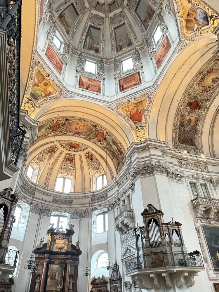 此前在欧洲旅游参观了不少教堂,其中包括全世界规模最大的梵蒂冈圣彼得大教堂,虽然萨尔茨堡大教堂不能与圣彼得大教堂相提并论,但萨尔茨堡大教堂是这座城市著名地标建筑,列为第二热门景点,谷歌评分很高,况且离我们住处只有200米,必须去打卡。