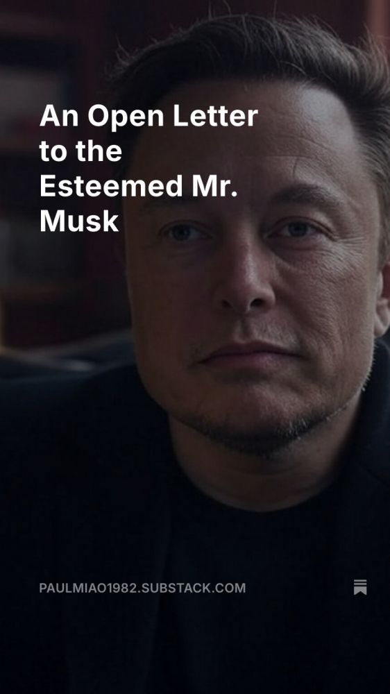 尊敬的马斯克先生,我的第一个浅见是有时候我模糊地感觉您对共产党可能有些误会。当然具体有没有我也没有绝对的把握,但是出于对您的尊敬,没有把握也还是想不揣冒昧地写出来,让您笑话了。
