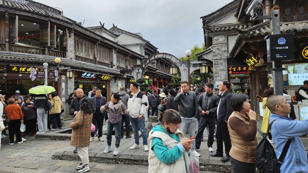 大理、丽江,都是只有两个城楼,没有城墙的小镇,束河古镇就更是只有一个牌坊。进去后都是在小块的麻石板路上走,石板路两边是商铺,饭馆。往日的古朴、宁静都没有了。导游也承认,这里以前都是穷乡辟壤,旅游业发展起来后,这里的人们生活才脱贫好起来。我们旅客来的任务就是"拉动经济"。说白了,就是多买东西,给钱他们用。奇了怪了,我们来游玩不是为了娱乐自己吗?为什么还要接受"任务"?導遊告诉我们,以前,束河古鎮的早上是很清靜的,当地鄉民們都是十点多十一点的時候才起床,早上的街道空無一人,只是聽到小鳥的叫聲。連花瓣都未完全打開,树叶的夜露仍在叶上头。现在古镇里走动的人和商铺里工作的人都是外来人员,没有几个是当地的少数民族。饭馆商铺里的人普通话说得溜,有些还会说粤语,粘着游客推销他们的商品。大清早街上游人就熙熙攘攘,穿少数民族服装的都是游客,高声叫嚷着拍照,哪里还有一点清幽闲静的意思呢。看古城古鎮還是建議去大同,平遥。