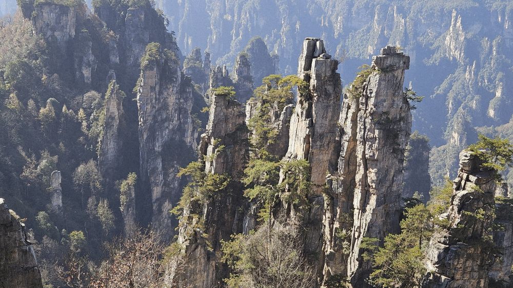 张家界以前叫大庸,古时就有人知道她的奇、险。但因为古时通讯不便,交通阻塞,只有很少人知道她的存在。1979年的时候,张家界还只是湘西的一个林场。画家吳冠中到湘西写生,偶然听说到了张家界的奇,伟和原始的美丽。他于是前去张家界一探究竟,看到了张家界的石峰石柱,大感震撼。作画记录其所见,并写下《养在深闺人未识——张家界是一颗风景明珠》的文章。这篇文章当时为多家媒体转载,于是张家界开始为大众所知。这个地区从默默无闻变成全国、乃至全世界都知道的旅游胜地,吳冠中居功至伟。所以张家界森林公园前竖起了吳冠中的铜象,对他表示感谢和纪念他把这颗风景明珠介绍给全世界的功绩。据说张家界一年中有180天下雨,就是说游客只有50%的机会能看到张家界的美景。我们这次算是很幸运,没有遇到下雨的天气。张家界山区满布着一条条屹然突起的石柱山,这些石柱山大部分高约二百多米,山上的岩石缝中还长着许多小树,这些树显示着非凡的生命力。岩石也表现出不一般的韌性,即使裂痕道道,却也巍然屹立。有些石柱是上大下小,看上去摇摇欲坠,但是长年坚持不倒。石柱上裂痕里长着的是矮矮的武陵松。一条条石柱之下,一片氤氲之气,树林生机盎然。这些特殊的石英砂岩石和松树,形成了张家界地区与别的山区不一样的景色,电影《阿凡达》就选取了这片奇特的山地作为电影叙事展开的地区。这片险峻秀丽的石柱山峰吸引了一大波慕名而来的各国游客。