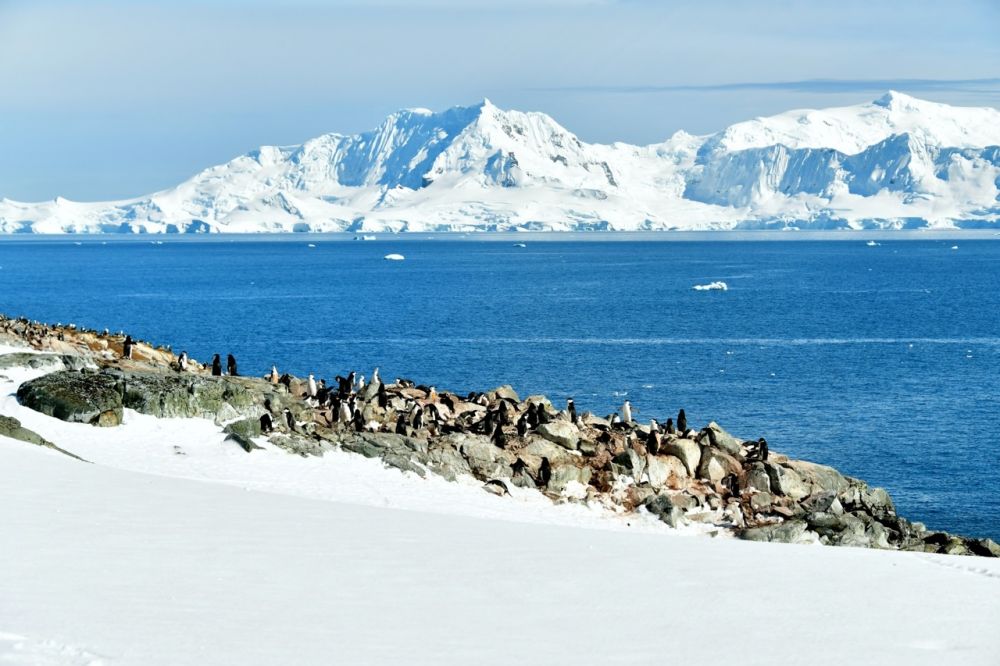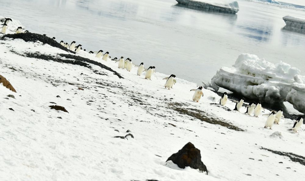 阿德利企鹅是法国探险家迪维尔在一八四零年发现后,以自己的妻子阿德利命名的。它们在南极的分布极广,在罗斯海,南极半岛和温德尔海周围的冰山上,岛屿上和南极大陆边缘上,海中漂浮的大冰块上,常见到它们的身影。我们有几次在冰块上看到的企鹅,都是这个品种。