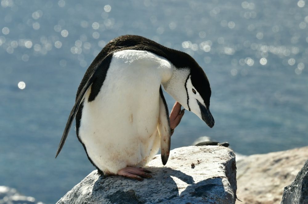 换班休息的帽带企鹅父母会下海捕鱼先喂饱自己,它们通常在周围的海域捕食,有时会一天游出八十公里,妥妥的游泳高手。小小的身体,为了生存能爆发出那么大的能量,不可思议。