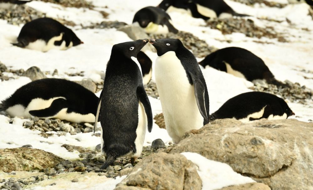 回来检查自己拍的阿德利企鹅照片,发现它们黑眼珠和白眼球的大小与位置在不同的场景有变化。比如下图中两个唧唧我我的一对,右边那只在陶醉中眯起了眼,黑眼珠几乎看不见。